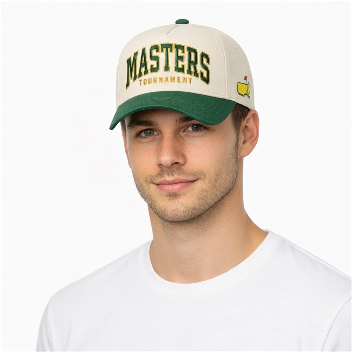 The hat is a masterclass in sports aesthetic and tournament tradition. Showcasing a pristine cream crown contrasted beautifully by the iconic Augusta Green bill, this piece is an instant visual classic. The front proudly displays the words “MASTERS TOURNAMENT” in an eye-catching, arched green typography with striking gold-yellow borders, ensuring the legacy of the event is front and center.