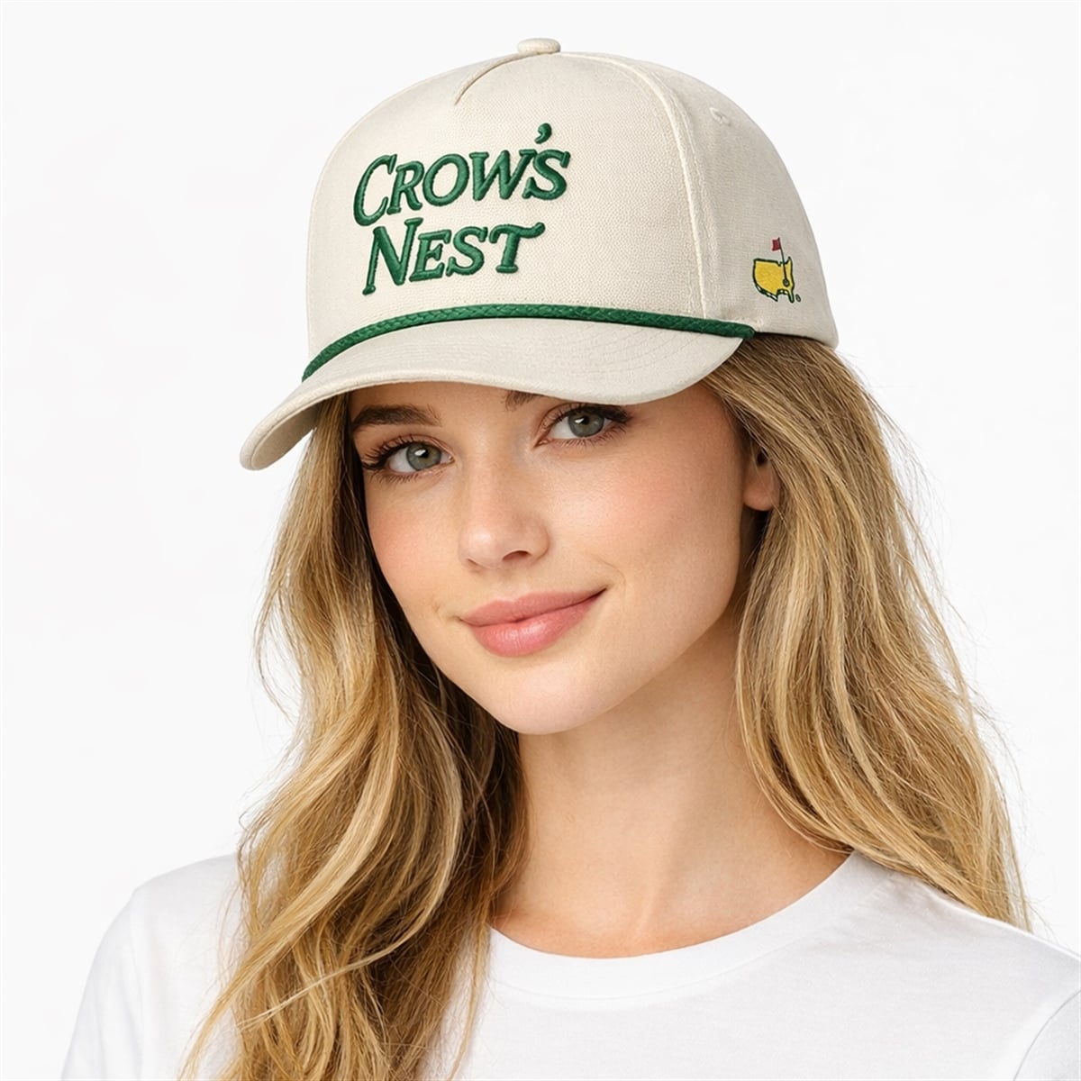 The hat presents a masterclass in classic, nostalgic golf styling. It features a clean, off-white cream base that serves as the perfect canvas for the striking, forest-green “CROW’S NEST” text emblazoned across the front profile. A traditional green rope spans the base of the crown, anchoring the retro aesthetic that has dominated modern golf fashion. To the left side of the wearer, the iconic Masters logo—the yellow map of the United States with a red flag stick planted in Augusta, Georgia—is beautifully rendered, confirming its authentic tournament origins.