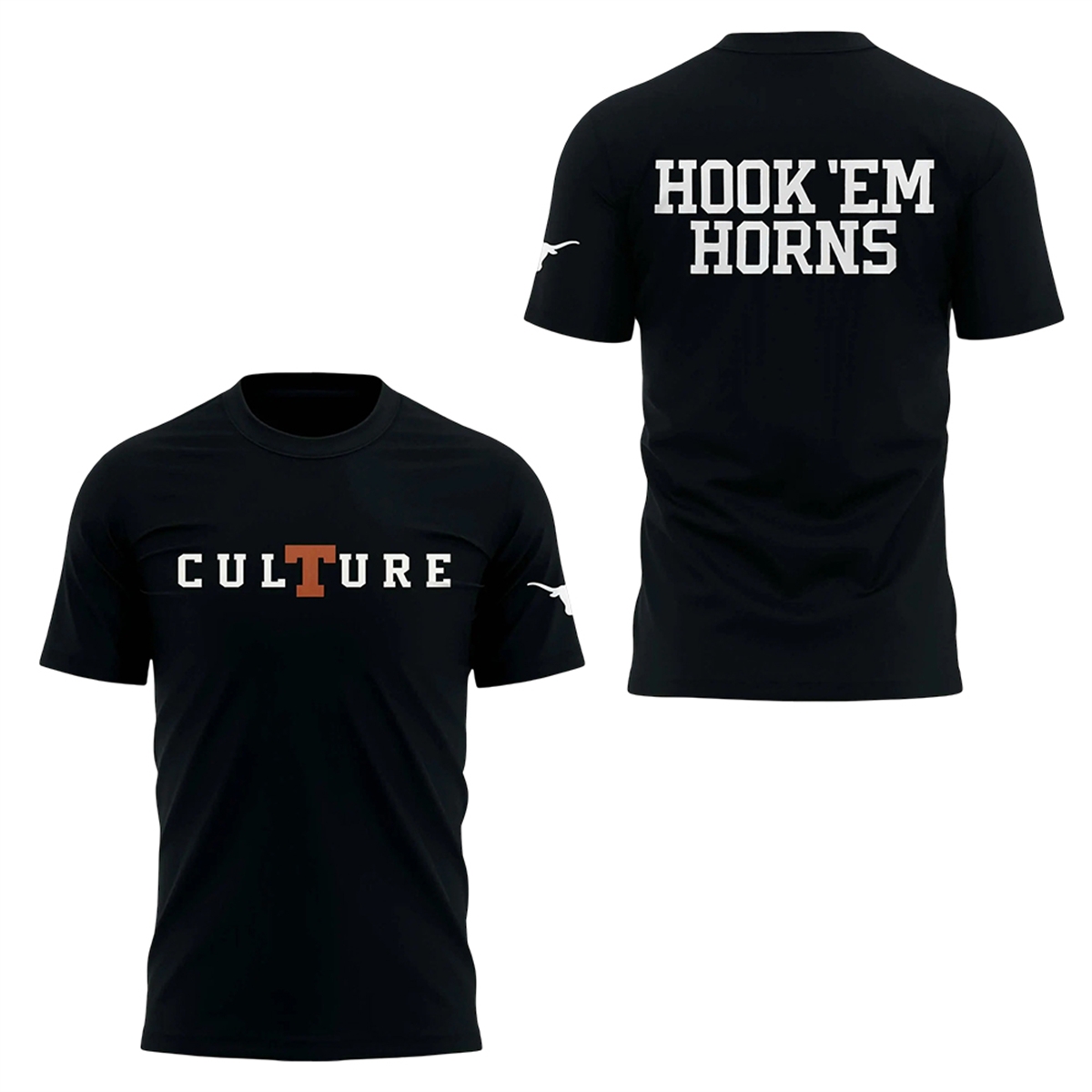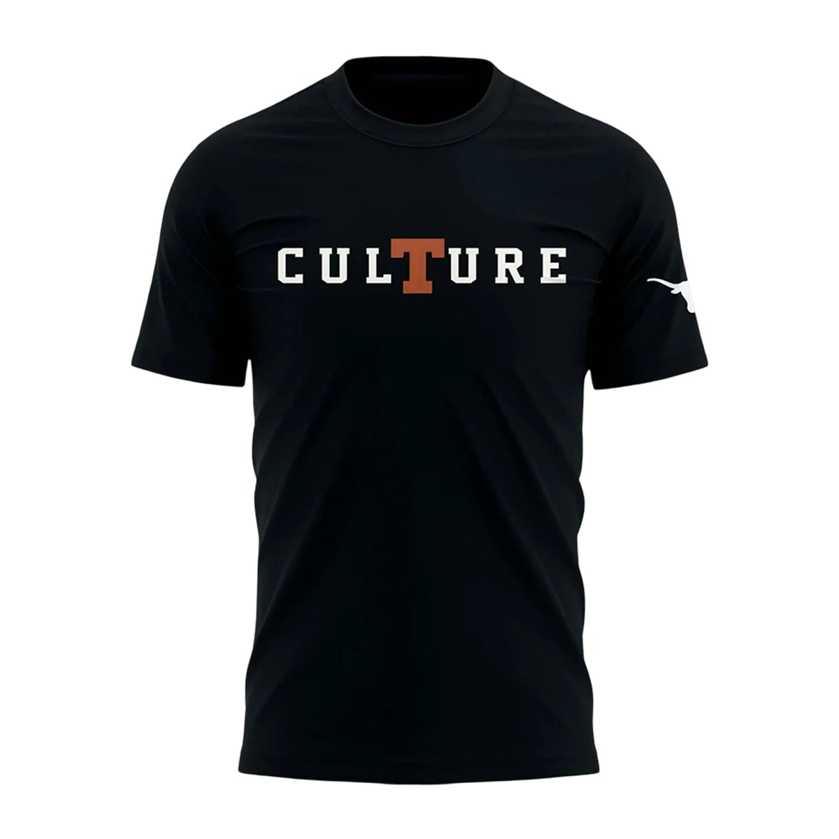 The shirt is a masterclass in minimalist yet impactful sports design. The front of the garment features the word “CULTURE” in bold, striking white typography, with a clever and eye-catching twist: the letter ‘T‘ is distinctly rendered in the university’s signature burnt orange. This subtle yet powerful color drop instantly anchors the design to the Texas Longhorns identity. Moving to the sleeve, fans will find the classic, unmistakable Longhorn silhouette, adding an extra layer of authentic team branding. The back of the shirt leaves no room for ambiguity, proudly displaying the legendary “HOOK ‘EM HORNS” rally cry in large, collegiate-style block lettering. This piece perfectly bridges the gap between modern streetwear aesthetics and traditional sports fandom, inspired directly by the team’s most famous supporter and his vision for the university’s athletic atmosphere.