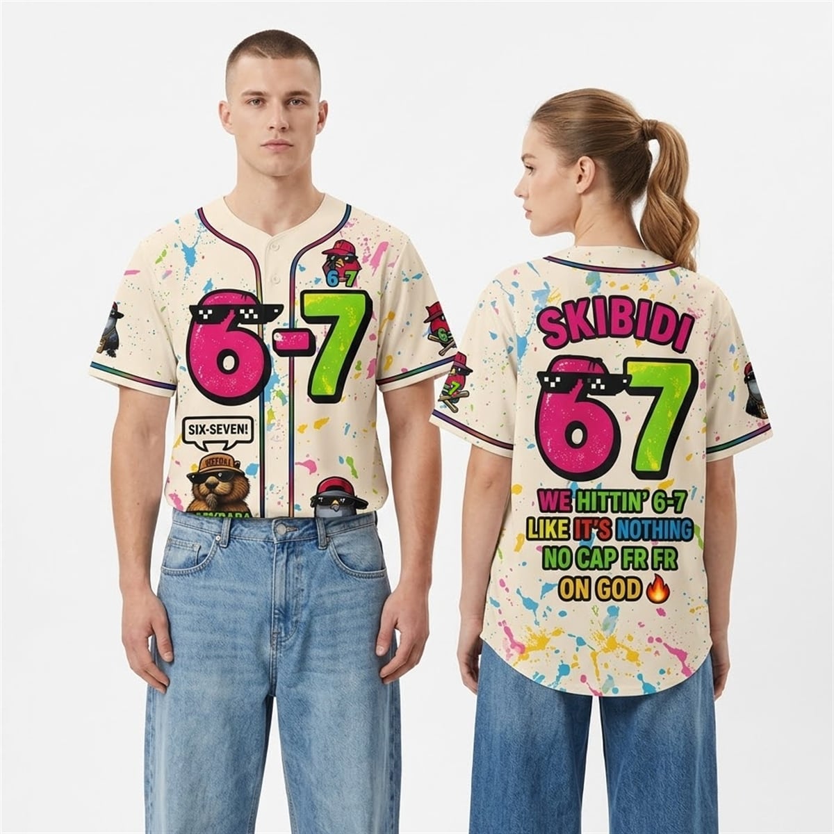 The jersey is a walking meme, transforming the classic baseball button-up silhouette into a canvas of pure digital anarchy. The front features a massive, vibrant pink and green “6-7” graphic sporting iconic MLG pixel glasses, accompanied by a speech bubble screaming “SIX-SEVEN!“. Below this, the internet’s favorite chill mascot—a capybara in a bucket hat—makes an appearance with the text “CAPYBARA TUNG TUNG TUNG SAHUR SAHUR.” To the right, a street-smart pigeon rocking a flat bill and a heavy gold chain completes the front-facing chaos. The back is just as unapologetic, with the word “SKIBIDI” arched over a giant “67,” followed by the ultimate modern slang declaration: “WE HITTIN’ 6-7 LIKE IT’S NOTHING NO CAP FR FR ON GOD 🔥“. Colorful paint splatters tie the entire chaotic masterpiece together.