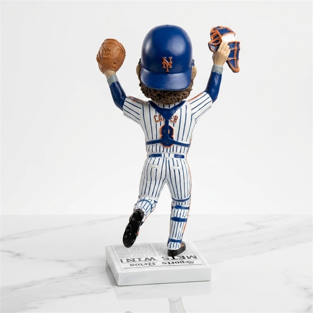 Step back into the electric atmosphere of October 1986 with a collectible that perfectly encapsulates the thrill of victory. This bobblehead features the legendary catcher, Gary Carter, in his most recognizable pose: arms raised high in sheer triumph, clutching his catcher’s mask in one hand and his mitt in the other. He is dressed in the classic 1980s home pinstripes, complete with the iconic vintage catching gear. Adding incredible historical context to the piece, Carter stands proudly atop a miniature replica of the famed “Daily News” front page, boldly declaring “METS WIN!” This thoughtfully designed base grounds the figure in the specific moment the Mets conquered the baseball world, serving as a dynamic centerpiece for any sports memorabilia display.