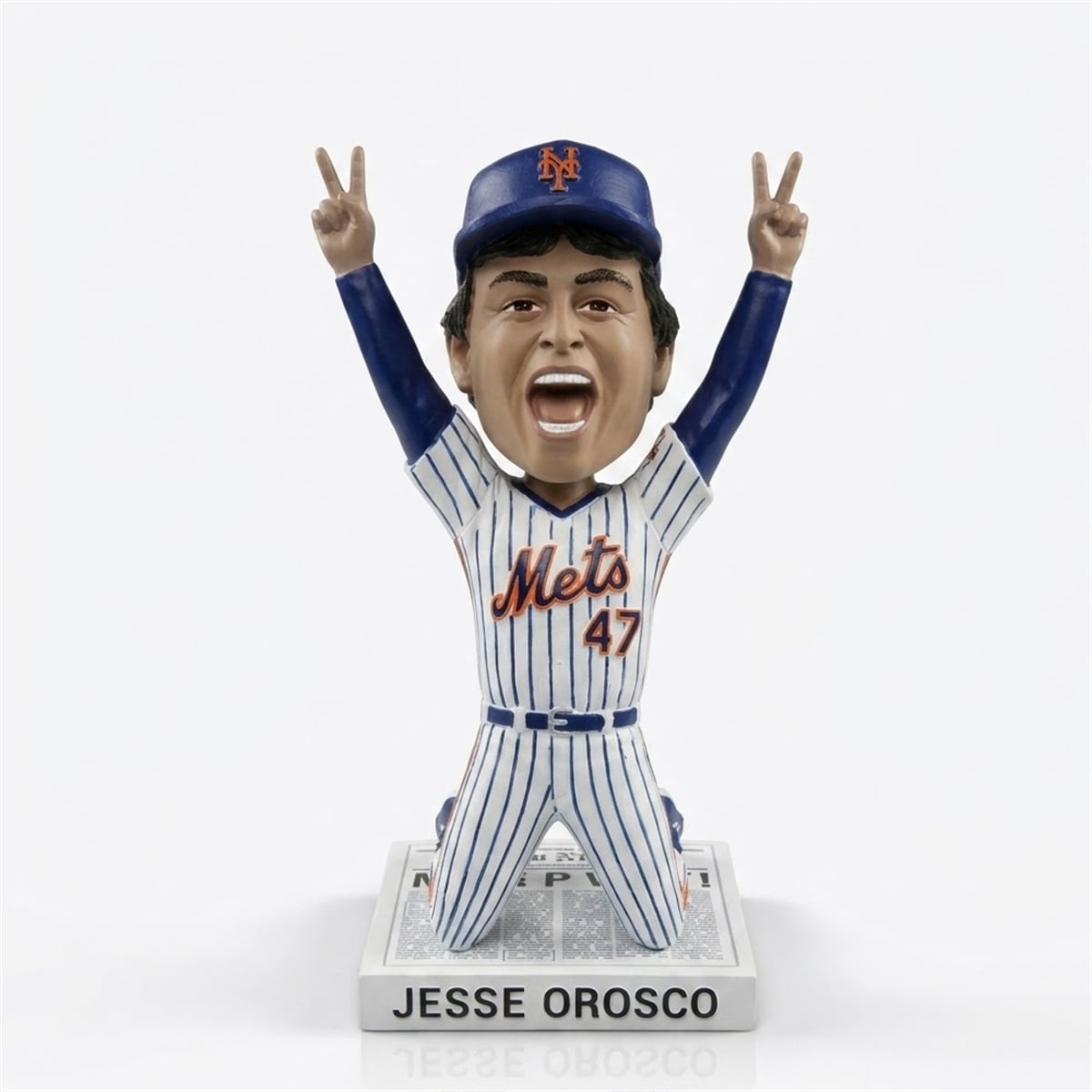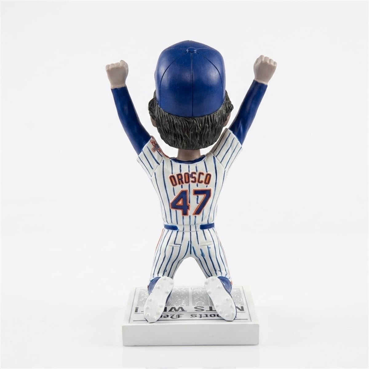 This bobblehead beautifully immortalizes the climax of the 1986 baseball season. The figure features relief pitcher Jesse Orosco in his home white pinstriped uniform with the iconic blue and orange trim, sporting his legendary number 47 on the back. The pose is instantly recognizable to any sports fan: Orosco on his knees, arms thrust toward the sky, face locked in an ecstatic shout just moments after striking out the final batter. Adding significant historical context to the visual presentation, the figure is mounted on a base designed to replicate a triumphant newspaper front page, complete with a bold headline announcing the team’s championship win.