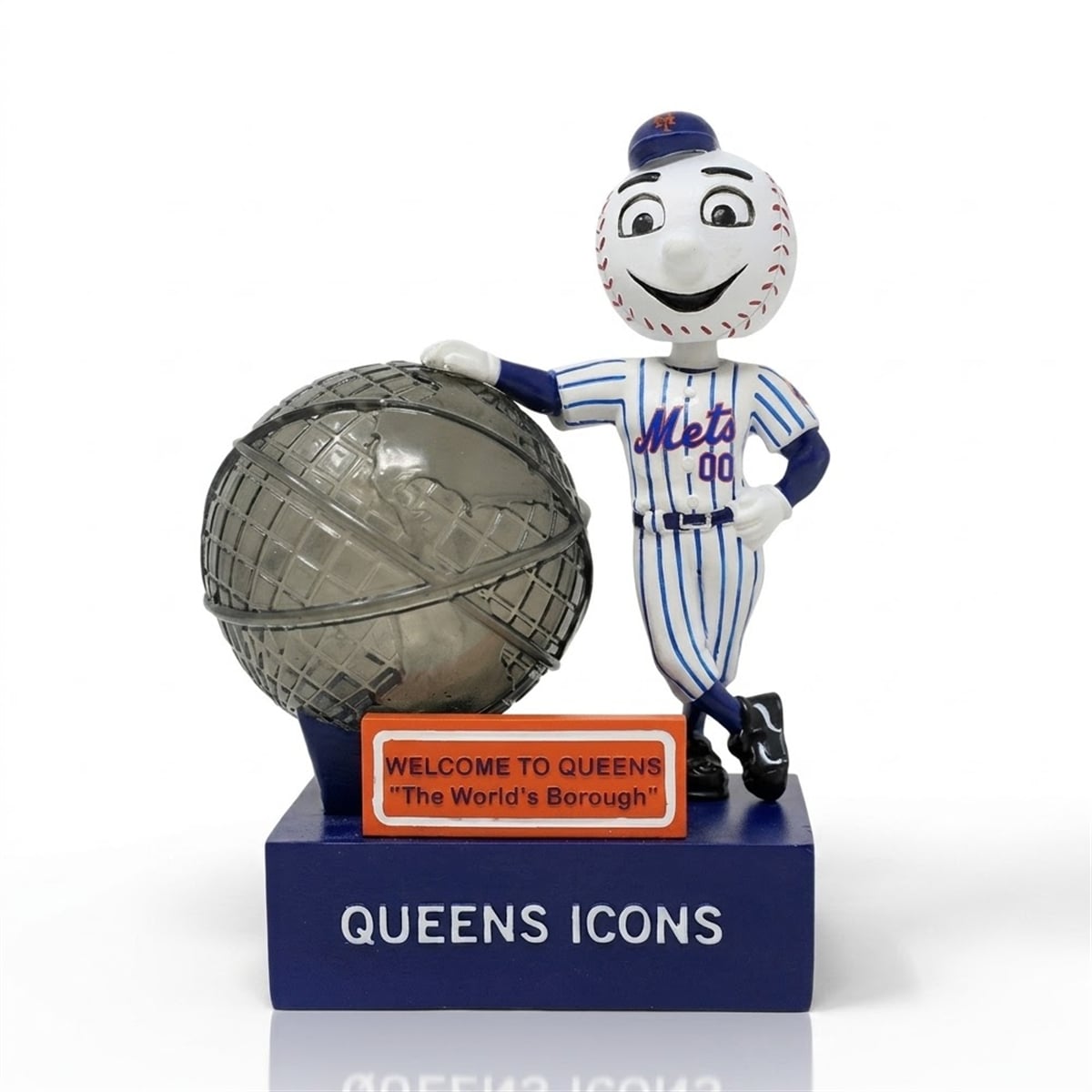 The bobblehead is a masterclass in sports-themed design, merging team spirit with civic pride. The figure features the perpetually smiling Mr. Met, dressed in the classic home pinstripe uniform, casually leaning against a detailed replica of the famous Queens Unisphere. The base of the collectible is a deep, striking blue prominently displaying the text “QUEENS ICONS.” Adding to the visual narrative is a bright orange sign planted at the front, reading “WELCOME TO QUEENS ‘The World’s Borough‘.” The standout feature of this collectible is its internal illumination; the Unisphere globe lights up, creating a captivating visual effect that transforms a traditional desk accessory into a dynamic display piece.