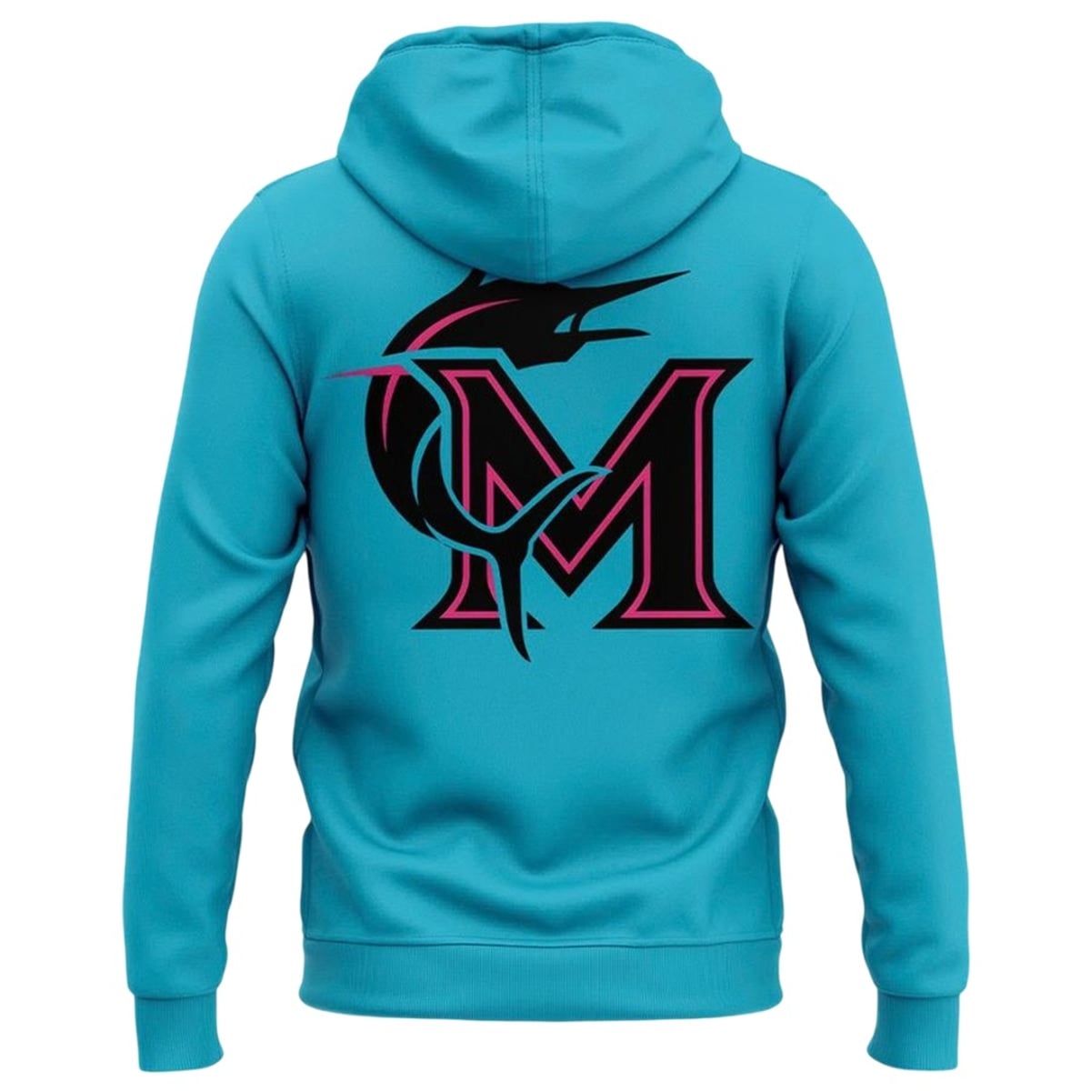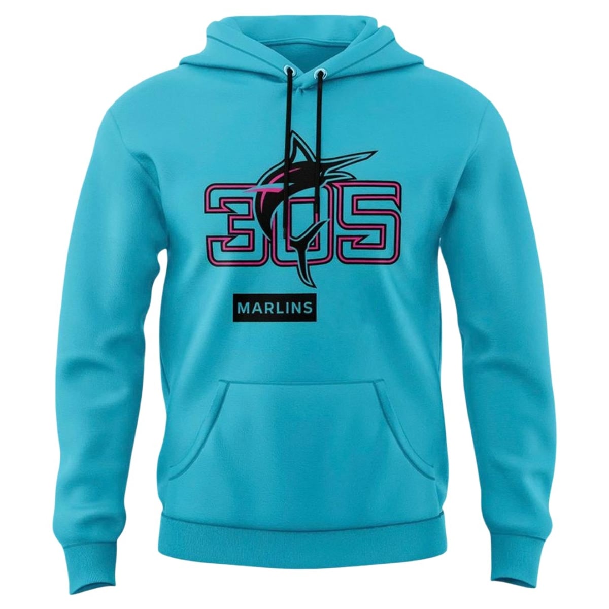 The hoodie is a visual masterpiece designed for the modern sports fan. Drenched in an eye-catching, vivid teal, the front of the garment proudly displays the number “305” in a stylized, block-letter font outlined in neon pink. Piercing through the center of the area code is the signature Miami Marlins fish emblem in a stark, contrasting black. Just below the primary graphic sits a minimalist, rectangular “MARLINS” patch, grounding the design. Turning to the back, the apparel makes an equally loud statement with a massive, stylized “M” bordered in that same electric pink, once again intertwined with the fierce black marlin. It is a cohesive, 360-degree celebration of South Florida’s vibrant identity.