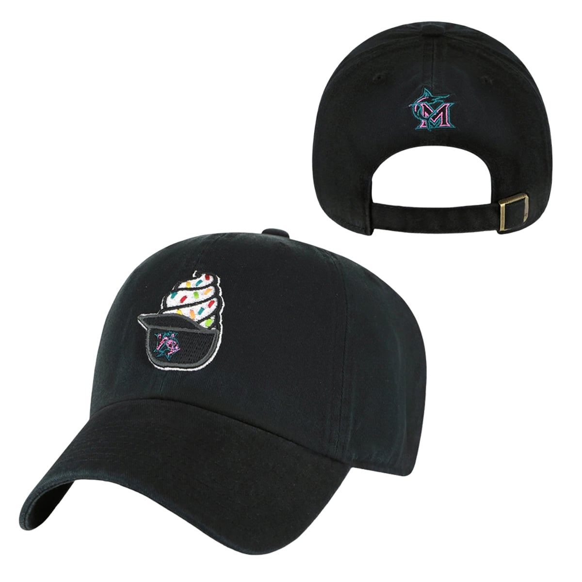 The hat is a brilliant fusion of athletic pride and culinary nostalgia. Set against a sleek, dark background, the front crown features a striking embroidered graphic: a classic swirl of vanilla soft-serve, complete with colorful rainbow sprinkles, resting perfectly inside a miniature black batting helmet. That miniature helmet proudly displays the Miami Marlins’ signature City Connect logo in vibrant neon pink and teal. The rear of the cap echoes this branding with the primary Marlins “M” logo, complete with the iconic fish silhouette, rendered in those same unmistakable South Beach neon hues. It is a playful, bold, and entirely unique take on baseball apparel.