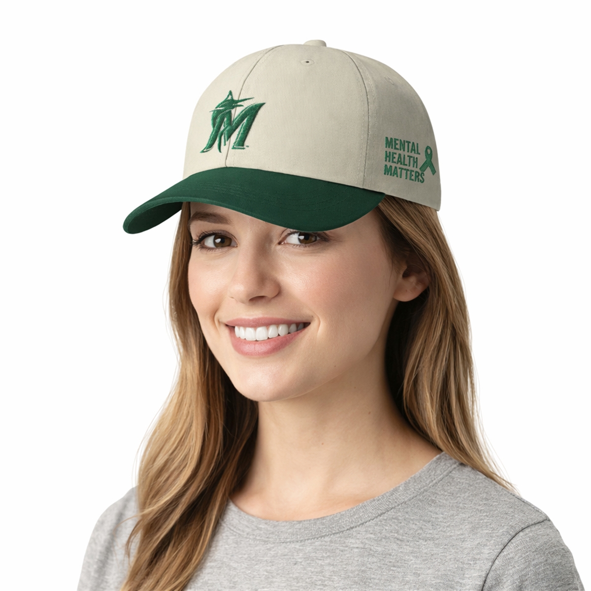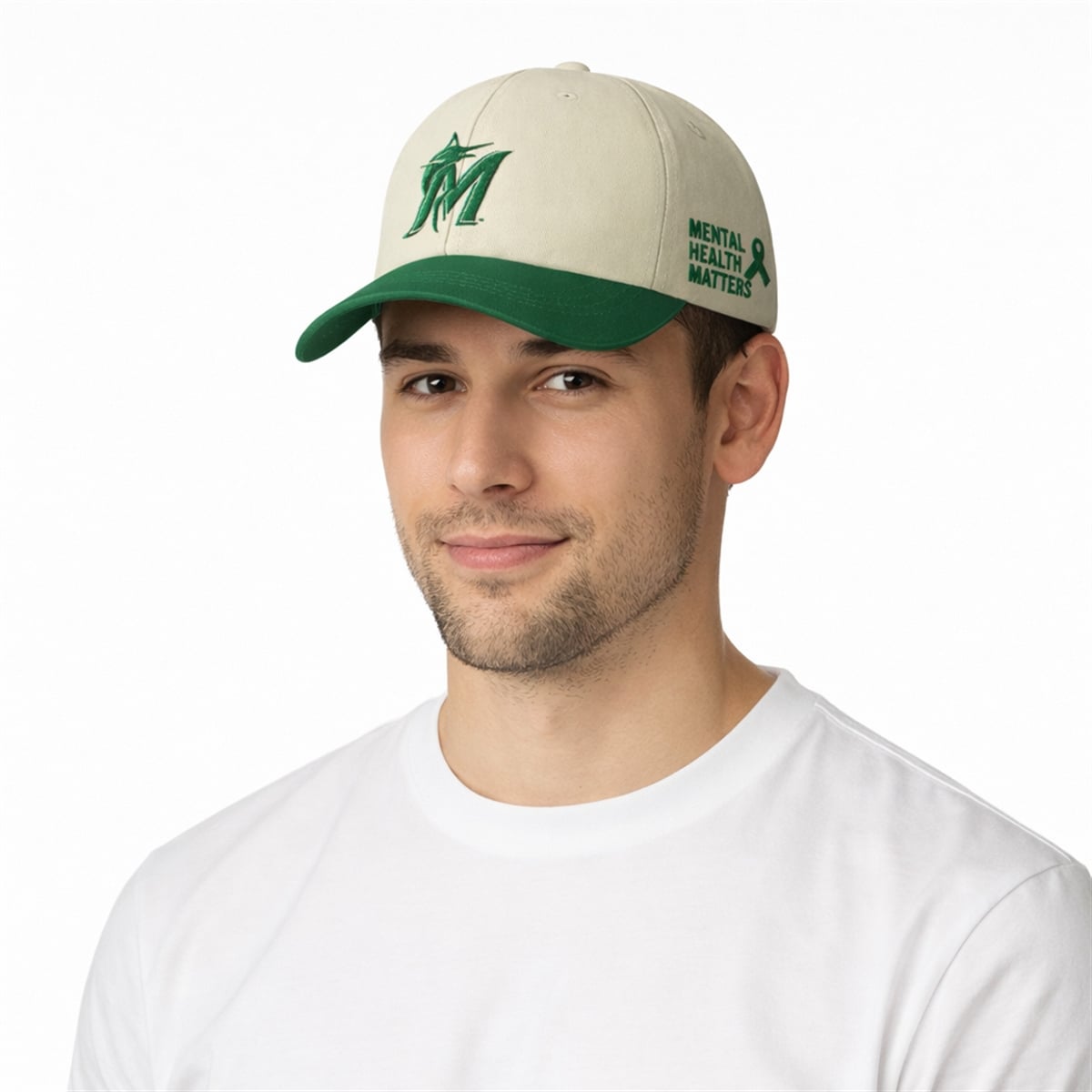 The hat is a visually striking accessory designed specifically for the team’s dedicated awareness night. The cap features a two-tone aesthetic, utilizing a neutral beige crown that perfectly offsets the deep green brim. Front and center, the classic Marlins ‘M‘ logo is reimagined in a matching vivid green, creating a cohesive and eye-catching look. The most defining feature rests on the side panel: the phrase “Mental Health Matters” embroidered next to the universally recognized green awareness ribbon. This design relies entirely on its bold color blocking and impactful messaging to stand out in any crowd, making it a highly sought-after piece of team history.