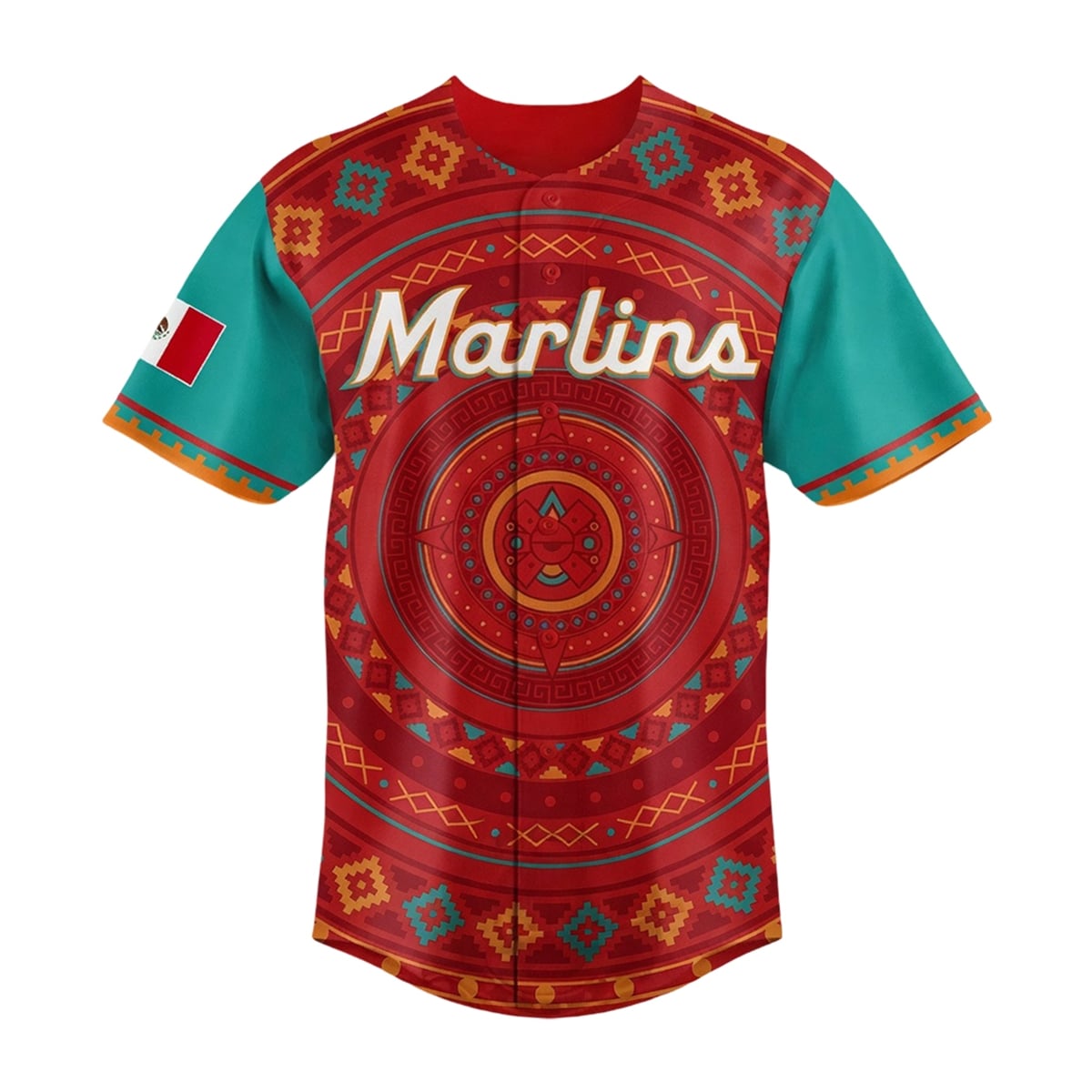 The jersey offers a breathtaking departure from standard baseball uniforms. The core of the jersey features a deep, vibrant red background adorned with intricate, golden-yellow and teal geometric patterns. Centered on both the front and the back is a large, majestic circular motif reminiscent of ancient Mesoamerican art. The sleeves offer a striking visual contrast, utilizing the signature Miami Marlins teal, complete with the Mexican national flag proudly displayed on the right arm. Across the chest, the classic “Marlins” script is elegantly positioned, tying the cultural elements directly to the franchise. Best of all, the back allows for complete personalization, letting fans add any name and two-digit number.
