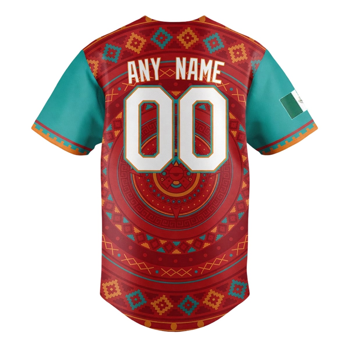 Every element of this jersey is rich with symbolism and historical significance. The prominent circular design dominating the torso is heavily inspired by the Aztec Sun Stone, representing the cyclical nature of time, cosmic balance, and the deep roots of indigenous Mexican history. The rich red base symbolizes the passion, energy, and lifeblood of the culture, while the surrounding stepped fret designs represent the connection between the earth and the heavens. By framing these historic motifs with the modern Miami Marlins teal sleeves, the jersey beautifully illustrates the modern Mexican-American experience—honoring ancient roots while celebrating present-day community and sportsmanship.