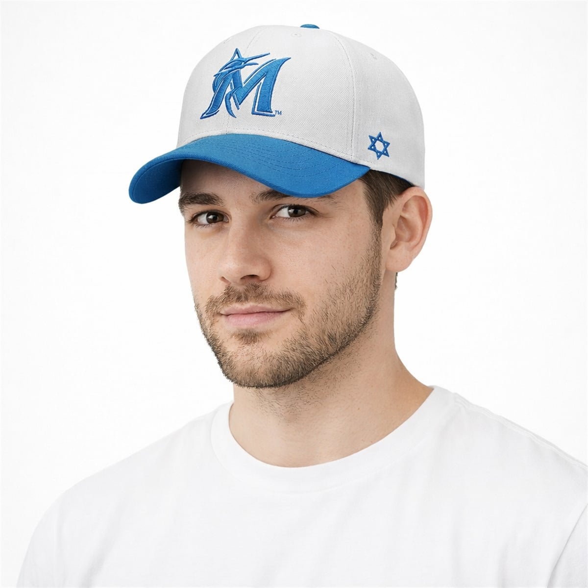 The hat is a promotional masterpiece released exclusively for attendees of the designated heritage night. Visually, the cap features a crisp, pristine white crown contrasted beautifully by a vibrant blue brim. The front is boldly adorned with the classic Miami Marlins ‘M‘ logo, rendered in a matching shade of blue. To complete the thematic design, the side panel features a precisely embroidered blue Star of David. This carefully curated colorway completely reimagines the team’s traditional look to honor the aesthetic themes associated with the holiday and Jewish heritage.