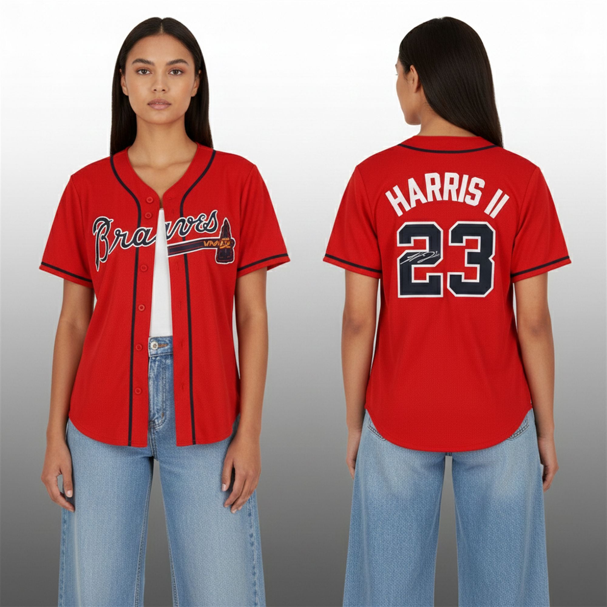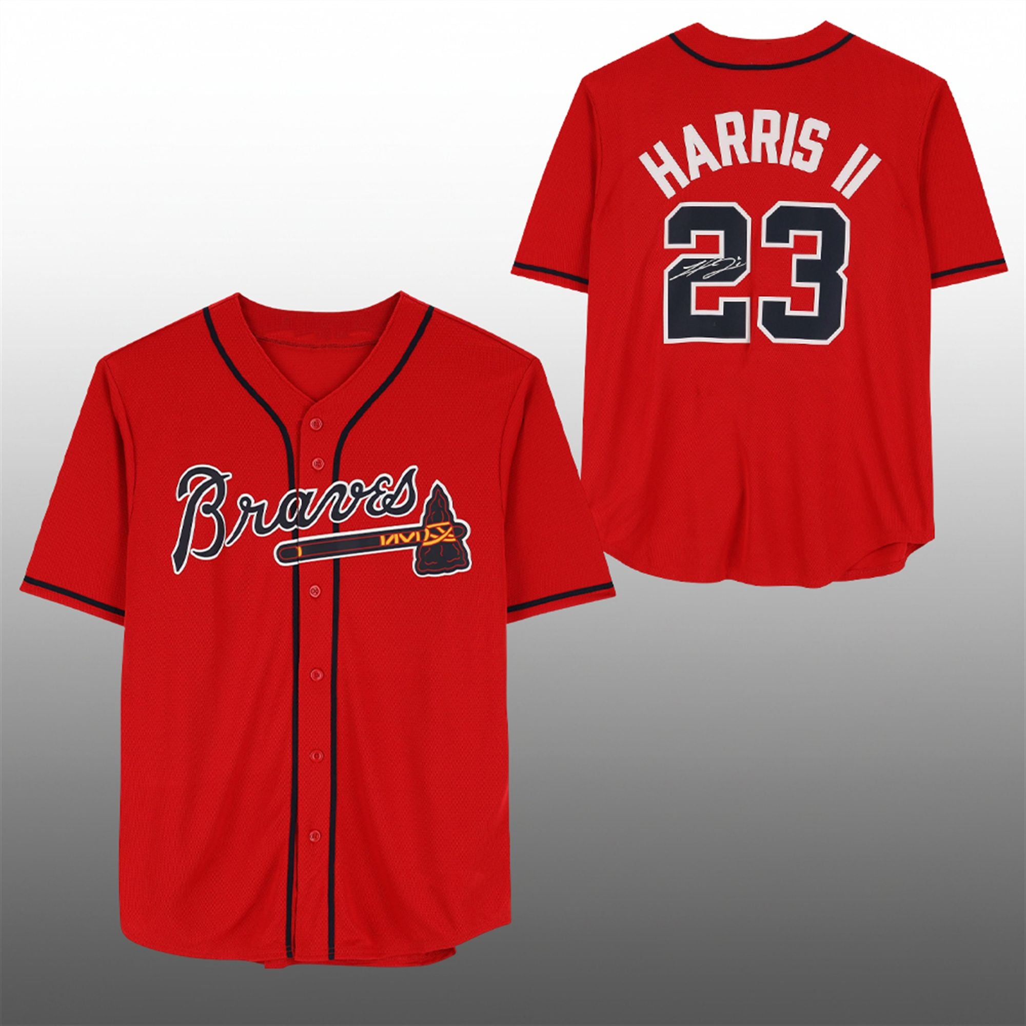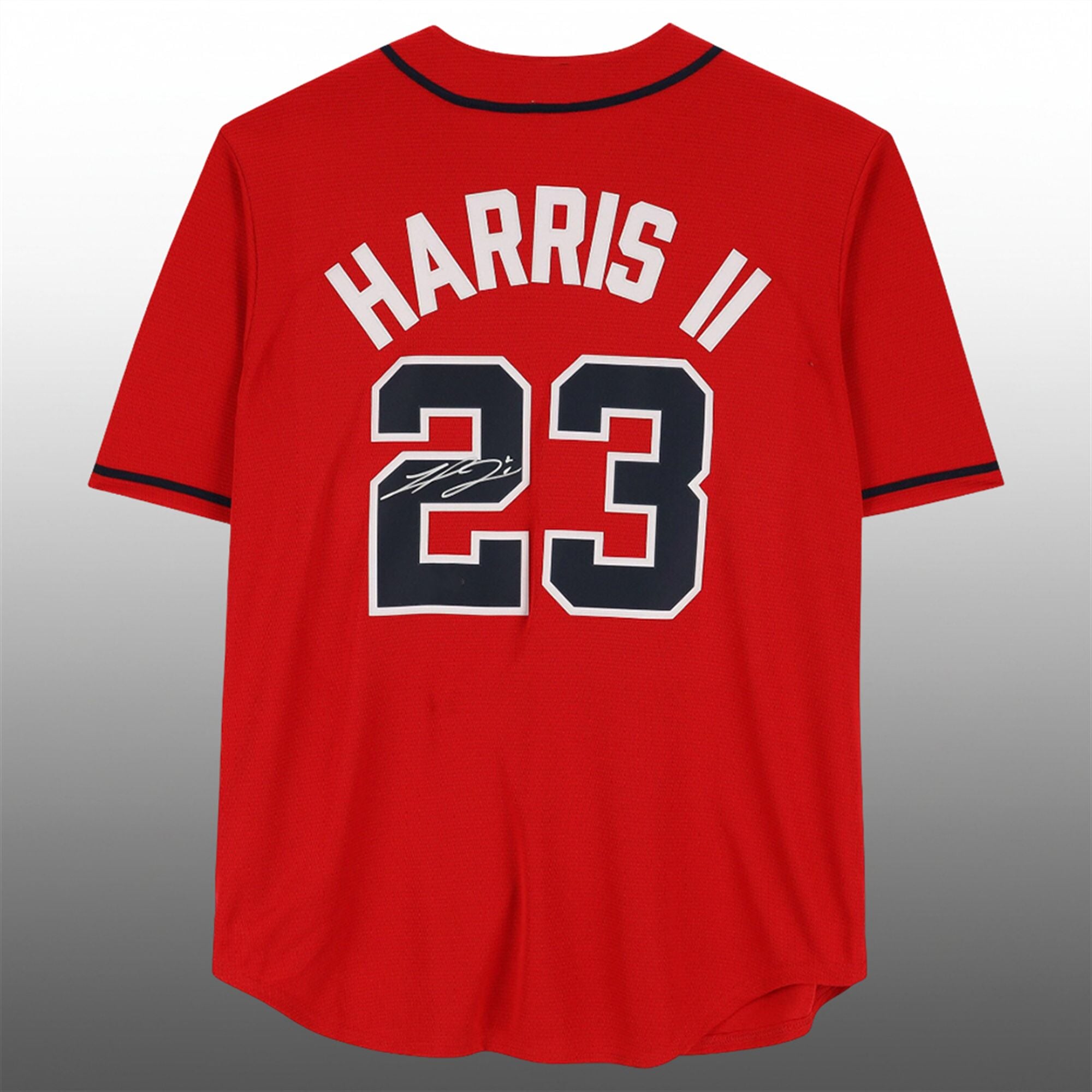 The vivid red colorway is accented with the classic navy script “Braves” logo across the chest, complete with the tomahawk distinctively detailed in navy and gold. On the reverse, Harris II’s name and number #23 are displayed in bold, tackle-twill styling that mirrors the on-field authentic look. This jersey is designed for the dedicated Atlanta Braves fan who values both style and player loyalty.