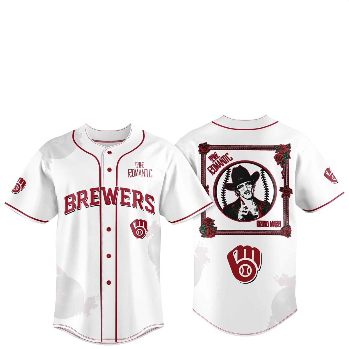 The back of the jersey transforms into a wearable canvas. It showcases a stunning, vintage-inspired graphic featuring Bruno Mars donning a stylish cowboy hat and aviator glasses, capturing the soulful, country-tinged aesthetic of his 2026 era. This portrait is beautifully framed by an intricate border of deep red roses and stylized typography reading “THE ROMANTIC” and “BRUNO MARS.” Below this central artwork, a larger version of the beloved Brewers logo anchors the design, cementing the collaboration between the artist and the city.