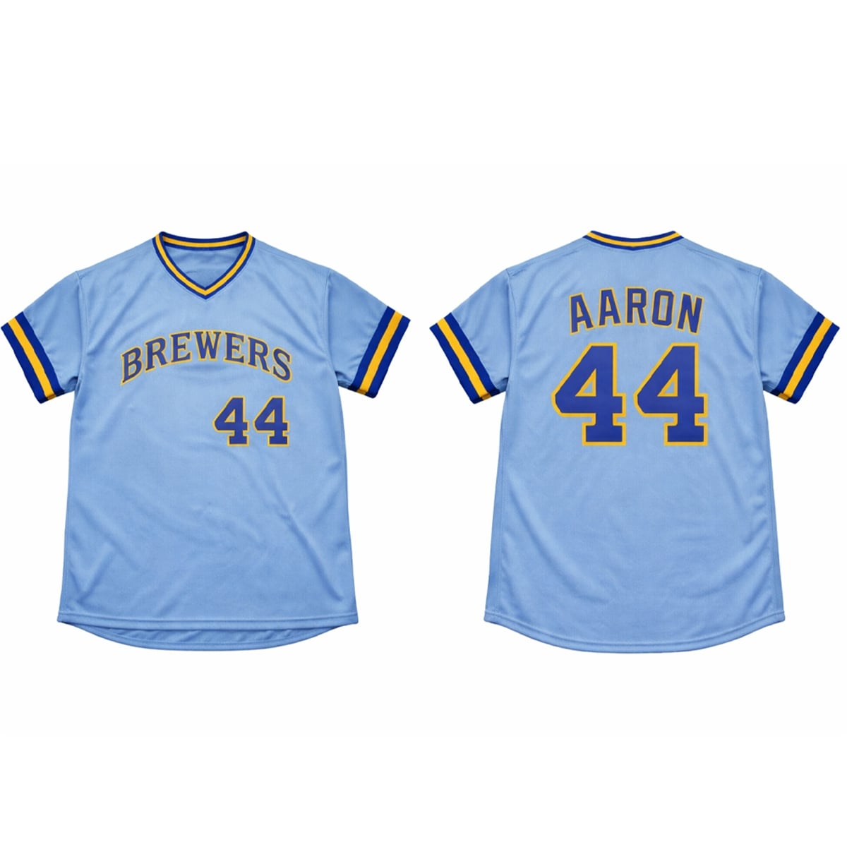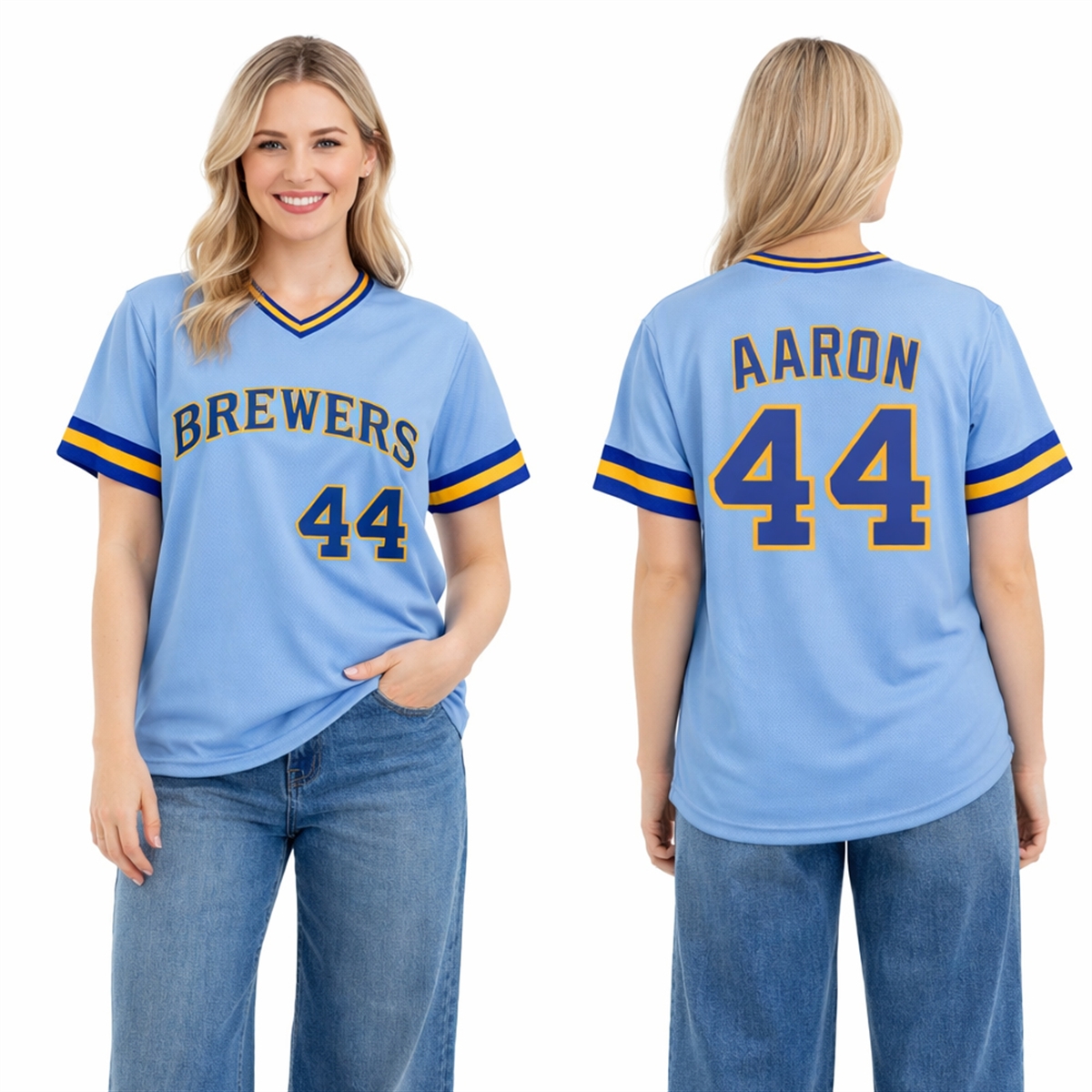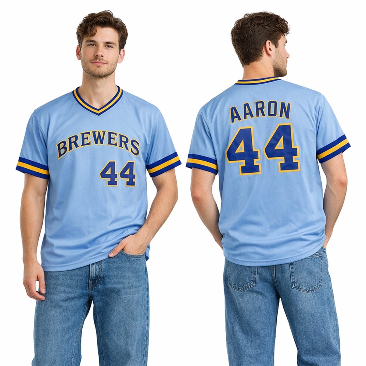 On the front, the classic “BREWERS” wordmark arcs proudly above the number 44, utilizing the vintage block-letter typography that defined the era. The back of the garment features the “AARON” nameplate resting above a massive, commanding number 44. Every visual element has been meticulously calibrated to evoke nostalgia, ensuring it looks entirely authentic to the years Aaron spent closing out his legendary career in the American League.