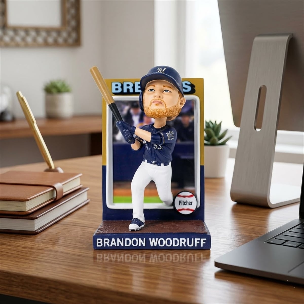 The profound meaning of this collectible lies in its nostalgic homage to baseball history. With rule changes in modern baseball standardizing the designated hitter, the sight of a pitcher taking a powerful swing is now a relic of the past. Brandon Woodruff is legendary among Milwaukee fans for hitting a spectacular home run during the 2018 National League Championship Series. This bobblehead immortalizes that specific brand of magic. By placing him against a trading card backdrop, the design elevates that singular memory into a permanent, legendary status, ensuring that the era of “Pitchers Who Rake” is never forgotten by the fanbase.