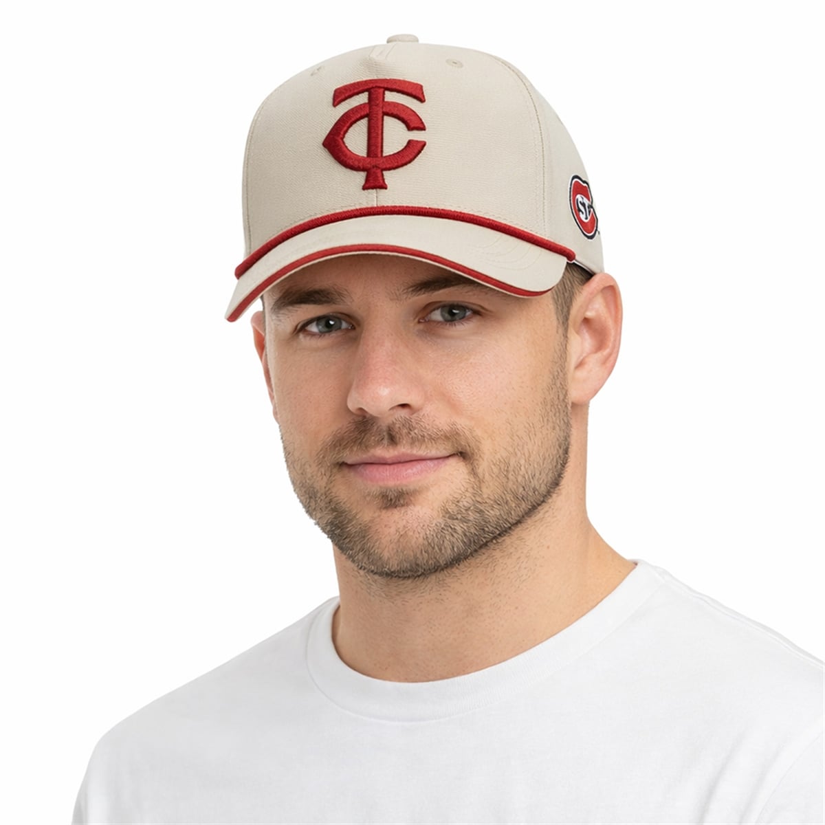 The hat is a visually striking piece of sports memorabilia that celebrates a unique collaboration. The design features a neutral, visually pleasing beige base that serves as the perfect canvas for the vibrant red accents. Front and center, the classic Minnesota Twins ‘TC‘ logo is prominently displayed in a rich, deep red.