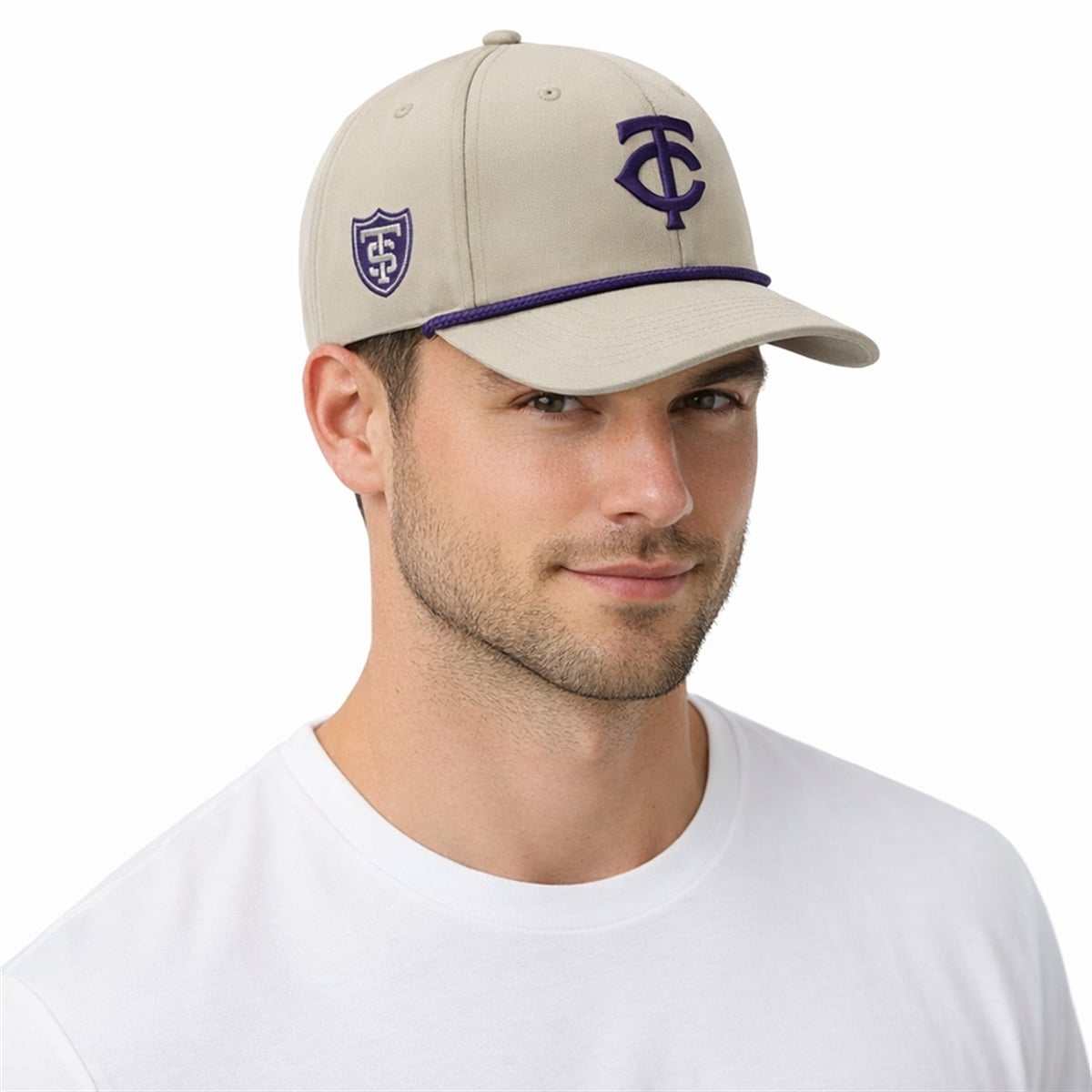 The hat is a special-edition promotional item created specifically for fans attending the dedicated theme night at Target Field. The hat features a versatile, neutral beige crown and bill, elegantly contrasted by a striking purple braided rope laid across the visor. Front and center sits the iconic interlocking Minnesota Twins “TC” logo, rendered in the University of St. Thomas’s signature purple. To complete the co-branded look, the right side of the cap proudly displays the official St. Thomas shield logo. This headwear merges the nostalgic, retro vibe of a classic rope hat with modern sports fandom, resulting in a stylish accessory that commands attention in any setting.