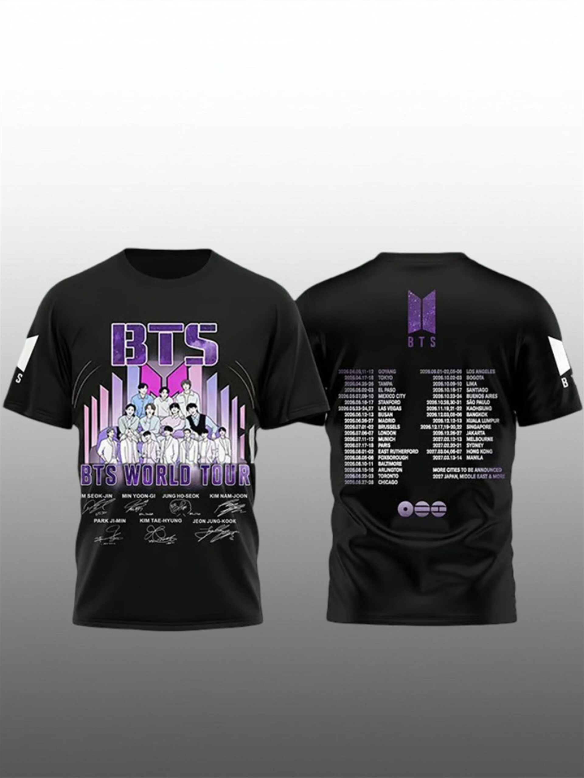 This design is tailored exclusively for the BTS ARMY—the millions of loyal fans who have awaited the group’s full reunion. The front of the shirt showcases a striking, high-contrast graphic of the seven members against a signature purple and black backdrop, symbolizing the “Borahae” (I Purple You) legacy. Below the portraits, the design includes the distinct, stylized signatures of all seven members, offering a personal touch that connects fans to their idols.