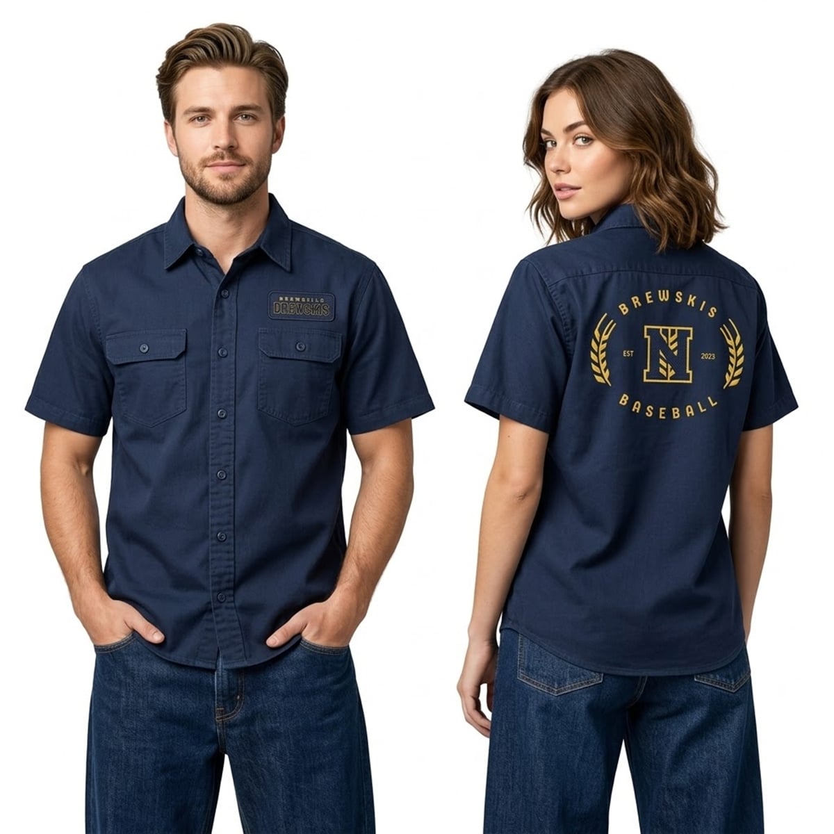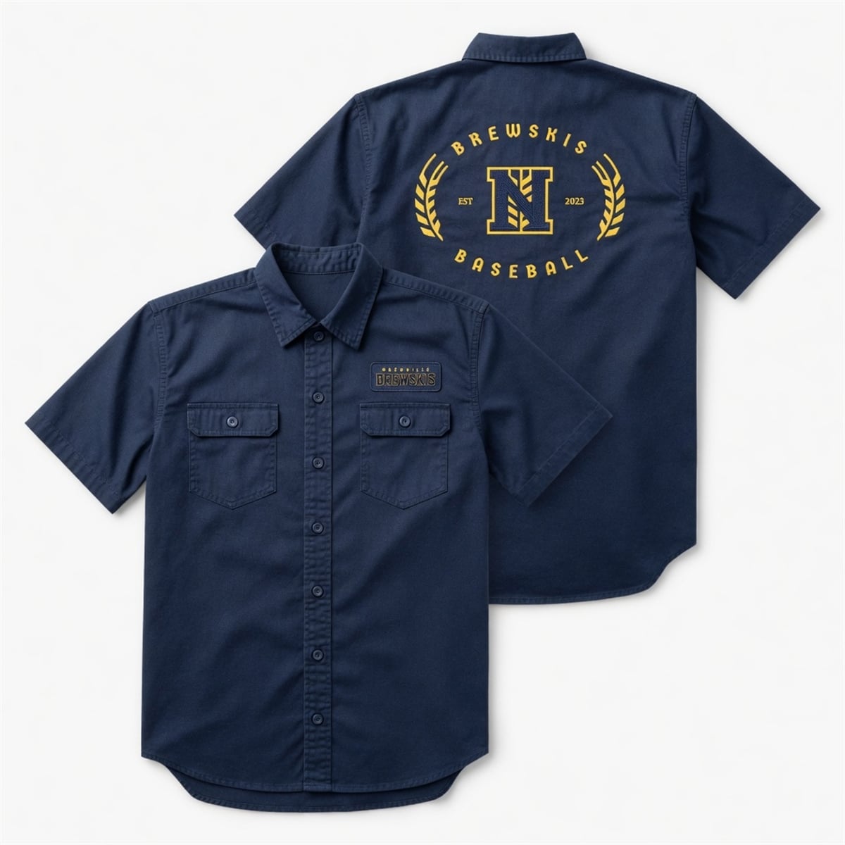 The front of the shirt offers a subtle, utilitarian aesthetic, equipped with dual chest pockets featuring button closures. Above the left breast pocket sits a rectangular patch, proudly displaying the “Brewskis” moniker. The true centerpiece of the item is located on the back. A large, circular graphic commands attention, showcasing a stylized block Nashville Sounds “N” at the center. This letter is flanked by curved stalks of wheat or barley, instantly recognizable symbols of the brewing process. The words “BREWSKIS” and “BASEBALL” arch above and below the central logo, while the text “EST 2023” is nestled neatly within the design, referencing the inception of this specific team promotion.