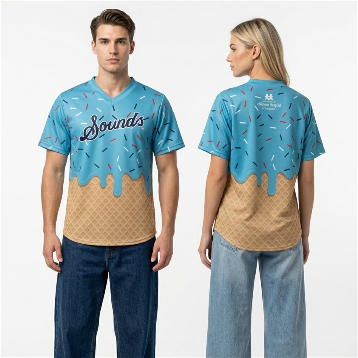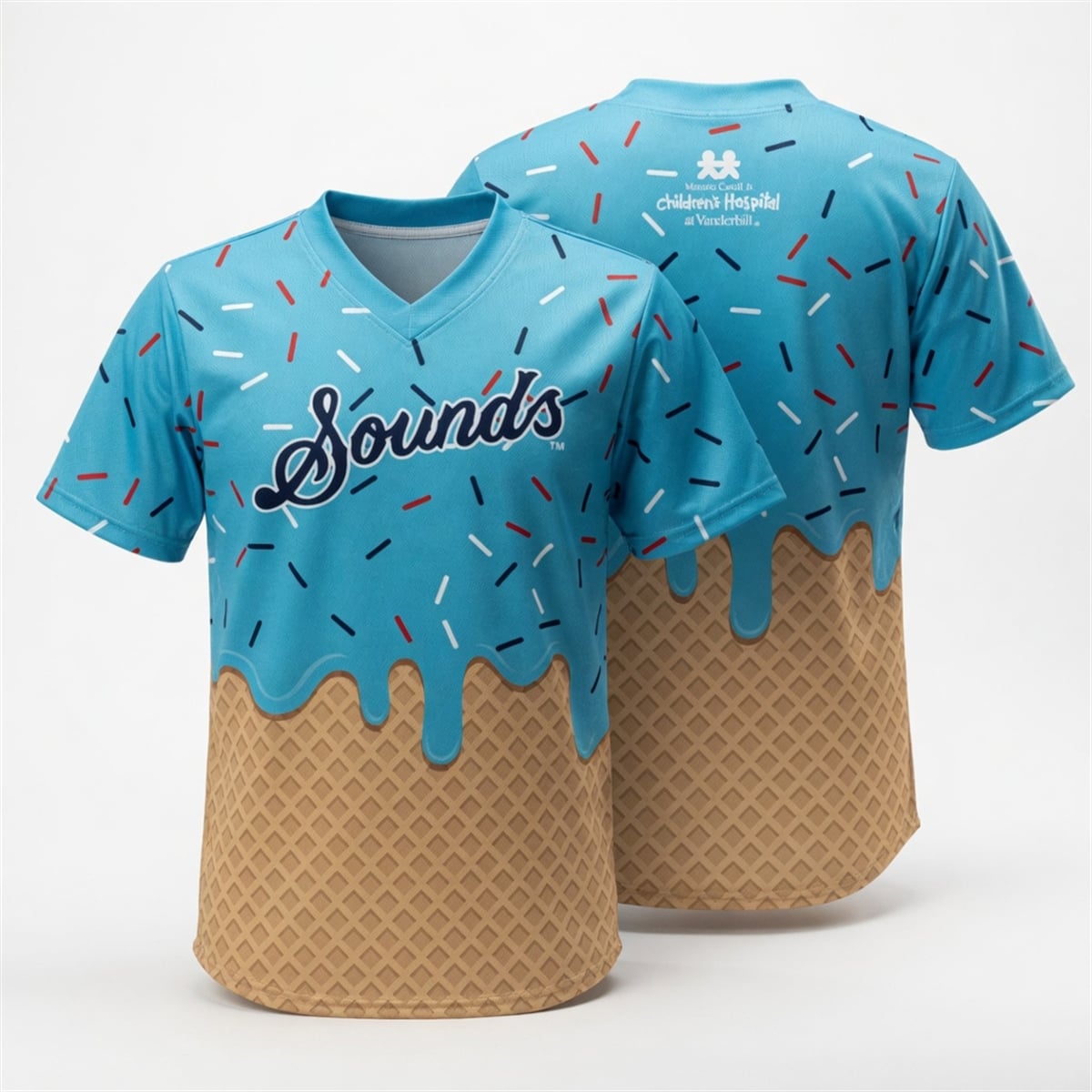The classic “Sounds” script logo is prominently displayed across the chest, integrating the team’s identity into the dessert-themed aesthetic. On the reverse side, the jersey proudly bears the logo for the Monroe Carell Jr. Children’s Hospital at Vanderbilt, signifying a strong partnership between the baseball club and a vital local healthcare institution. Every visual element has been meticulously placed to evoke the carefree, joyous atmosphere of enjoying a sweet treat at the ballpark during a warm summer evening.