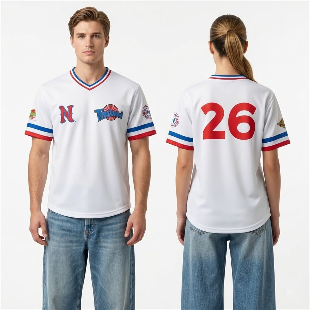 The jersey is a visual masterpiece that celebrates a beloved era of entertainment. The front features a crisp white base, accented by striking red, white, and blue striping along the V-neck collar and sleeve cuffs. On the right chest, the signature red and blue “N” proudly represents the Nashville Sounds, while the legendary “Tune Squad” emblem anchors the left chest, instantly recognizable by any pop-culture enthusiast.