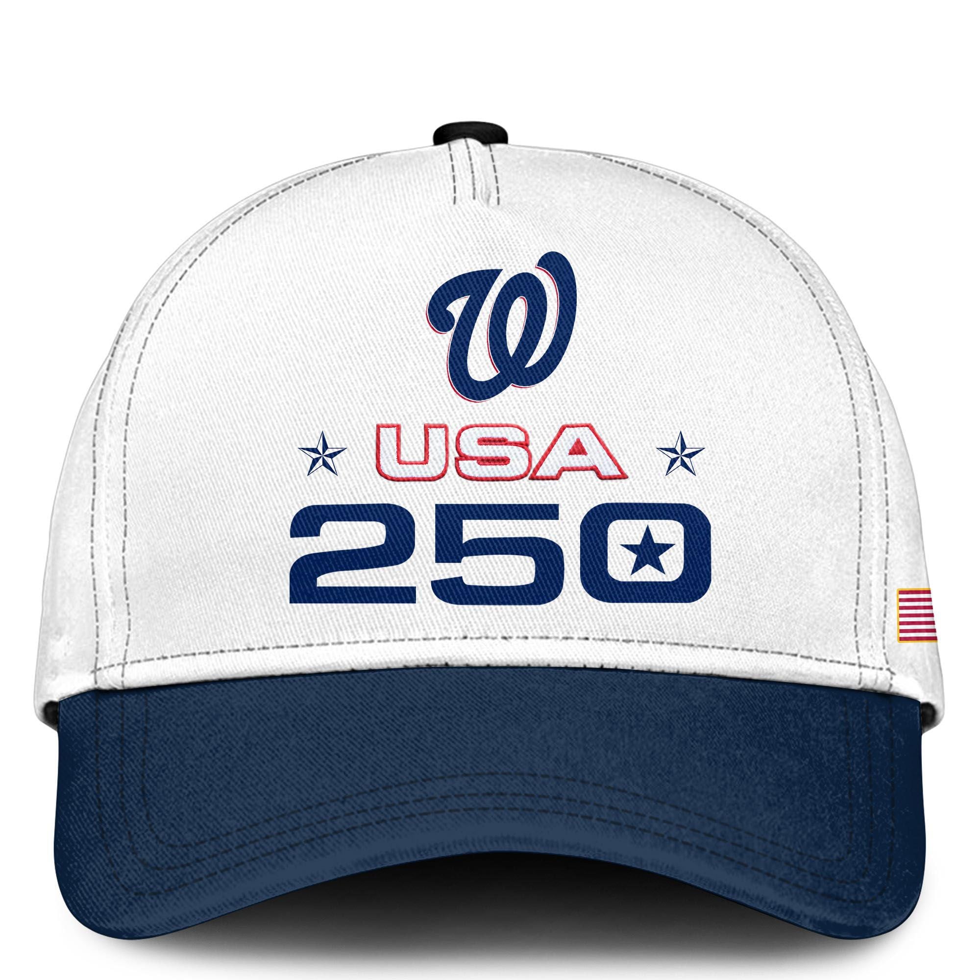 The design utilizes a pristine white canvas to make the patriotic colors explode with vibrancy. The front features the classic “Nationals” script in deep navy, underscored by the “America 250” commemorative logo on the chest, signifying the wearer’s participation in this historic year. The sleeve features a detailed American flag, while the back is a bold declaration of location and occasion: “WASHINGTON” arched proudly over a massive “USA 250” graphic, flanked by stars and anchored by the team’s signature logo.