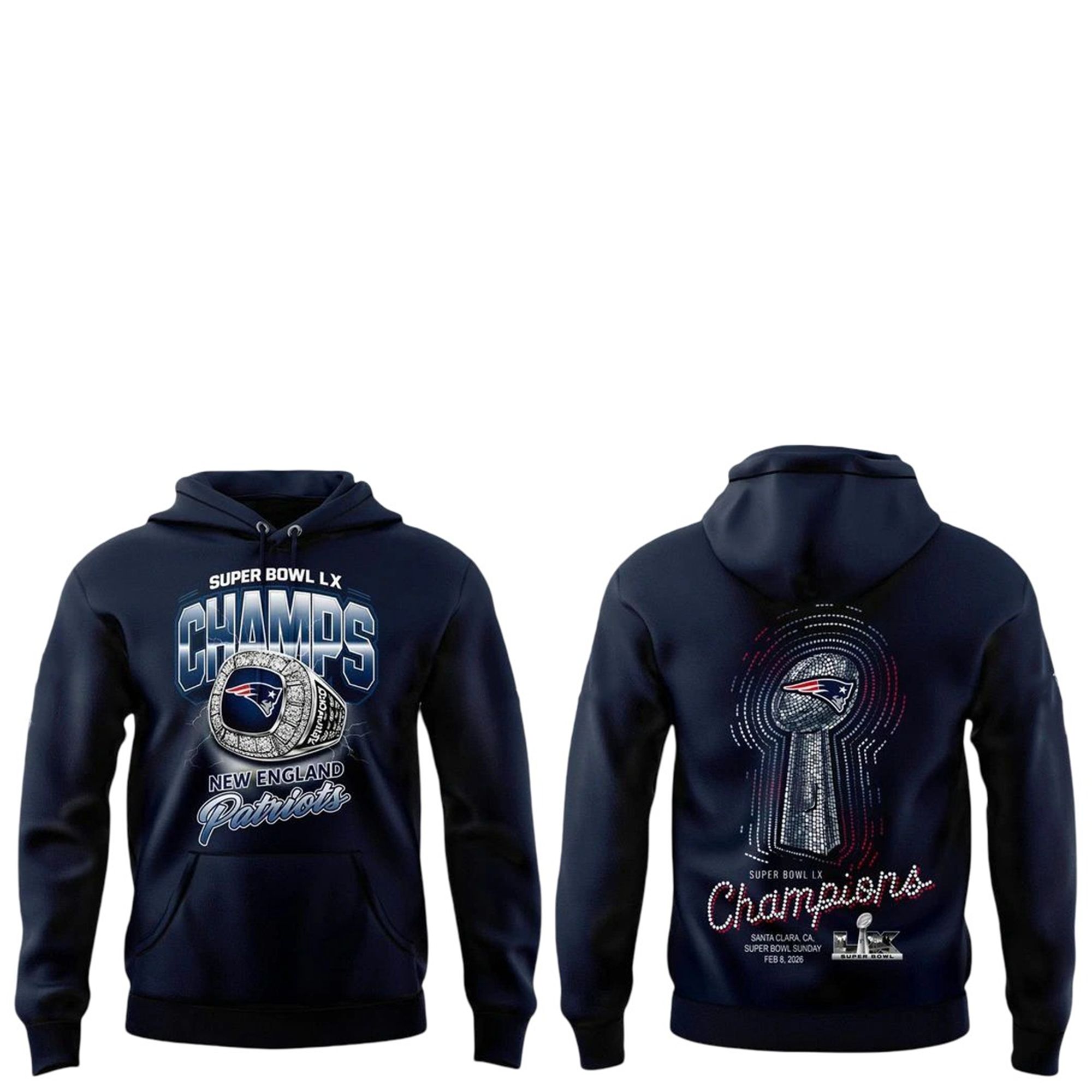 This specific design exploded across social platforms immediately after the game because of the “Ring Reveal” effect on the front graphic. Fans loved how the oversized, hyper-realistic ring graphic looked almost three-dimensional on camera, leading to a massive wave of #PatsRing selfie trends. The combination of the futuristic Super Bowl LX logo with the classic Patriots script created a “New Era” aesthetic that resonated perfectly with younger fans celebrating their first adult championship memory. It became the must-have item not just for the win, but for the “fit check” at the victory parade.