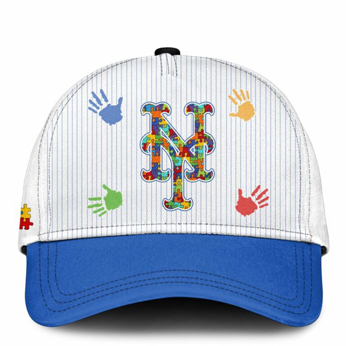 Across the chest, the iconic “METS” lettering is filled with a matching intricate puzzle pattern, instantly drawing the eye. Vibrant, life-sized handprints in shades of green, blue, yellow, and red are thoughtfully placed across the front and back, adding a deeply personal touch to the garment. Turning to the back, the jersey proudly displays an oversized, interlocking “NY” logo, also utilizing the puzzle aesthetic. Below this, the words “AUTISM AWARENESS” are spelled out in bold, cheerful, rainbow-colored typography, ensuring the message of the campaign is unmistakable from every angle.