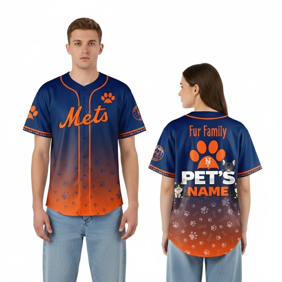 The jersey is a visually captivating piece of fan apparel designed to celebrate both the iconic baseball franchise and the wearer’s beloved companion animals. The design features a stunning visual transition, utilizing a gradient that fades from a deep, classic navy blue at the top down to a vibrant, energetic orange at the bottom. Across the front, the legendary “Mets” script sits proudly across the chest in its signature font, accompanied by the interlocking “NY” logo.