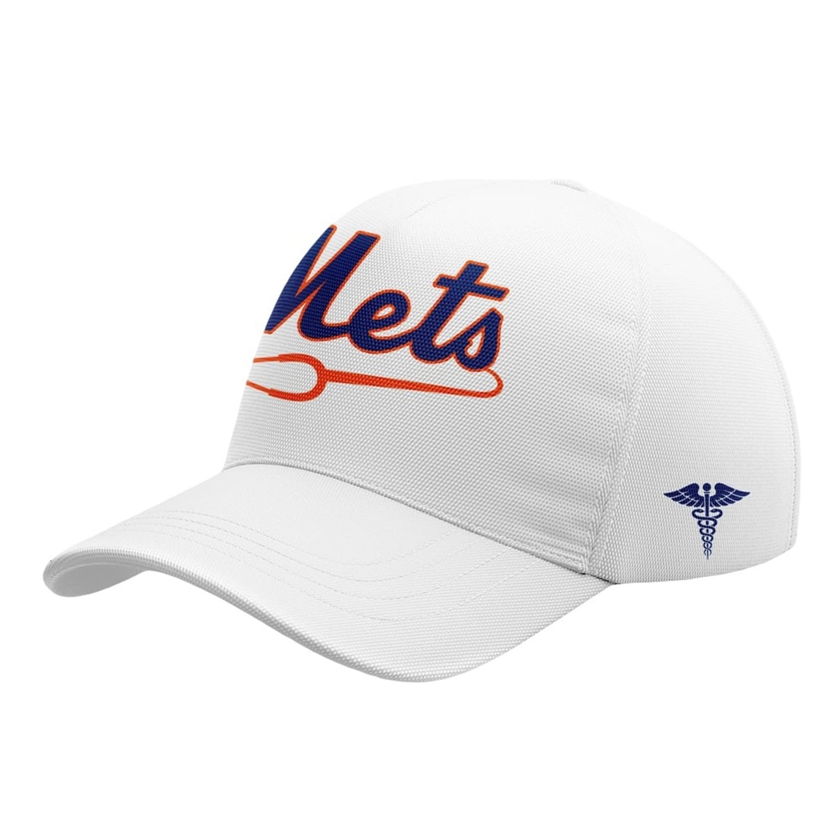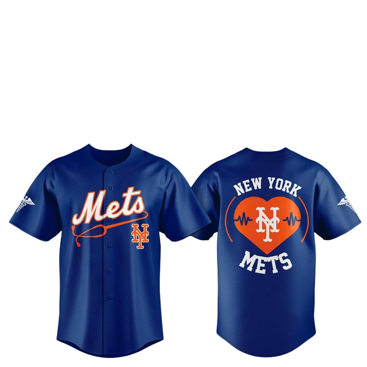 Turning to the back, the phrase “NEW YORK METS” boldly arcs around a vibrant orange heart. Cutting directly through the center of this heart is a dynamic EKG heartbeat line that forms the shape of the interlocking NY emblem. Furthermore, the sleeves are adorned with the Caduceus symbol—the classic winged staff with intertwined serpents—solidifying the medical theme. Every visual element has been thoughtfully curated to blend sports fandom seamlessly with a tribute to the medical field.