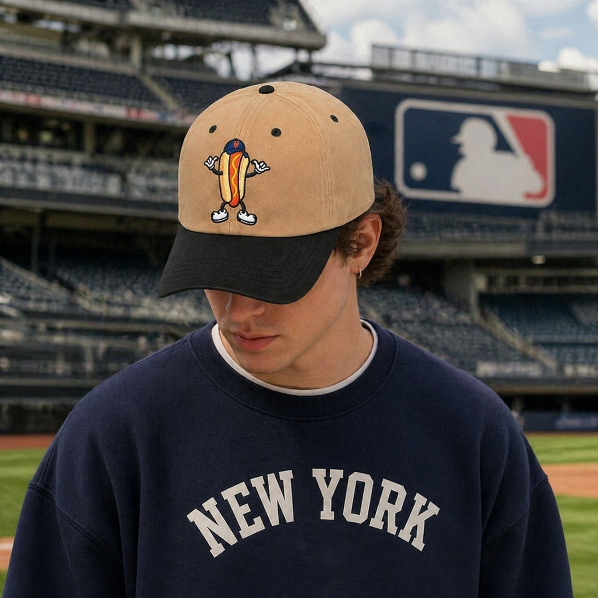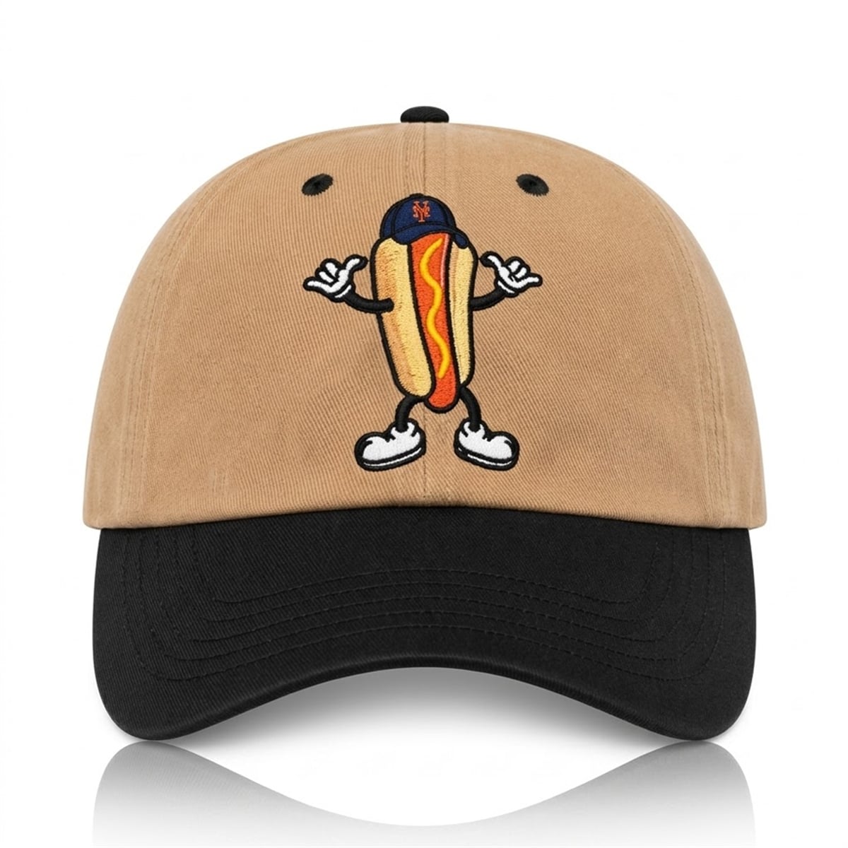 The hat is a masterclass in modern sports fashion, combining nostalgia with contemporary streetwear sensibilities. The design centers around a rich tan crown paired seamlessly with a deep black brim, creating a versatile, neutral base. At the focal point sits the legendary hot dog character—a smiling, gloved, and sneaker-wearing frankfurter sporting its very own miniature Mets cap. With arms outstretched in a welcoming, celebratory pose, the mascot graphic adds an undeniable element of fun and whimsy to your wardrobe. This item completely reimagines traditional sports apparel, allowing fans to express their allegiance in a highly unique, engaging, and photogenic way.