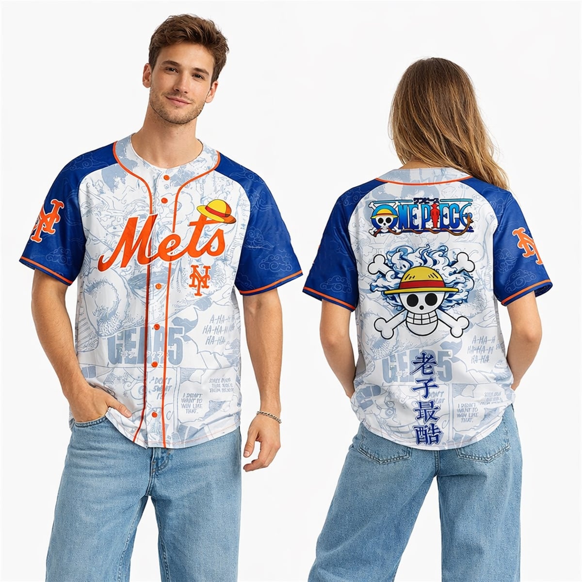 This 2026 collaboration piece is a visual masterpiece that completely reimagines standard fan apparel. The front of the jersey features a striking white and blue color-blocking scheme, accented by the Mets’ signature orange piping. The classic “Mets“ script is creatively modified, with a perfectly placed straw hat resting playfully on the letter ‘t’. Behind the striking team branding, the jersey is heavily layered with faded, stylized manga panels showcasing Luffy’s legendary “Gear 5″ transformation, complete with iconic dialogue bubbles like “A-HA-HA-HA” and “DON’T SWEAT IT!!”.