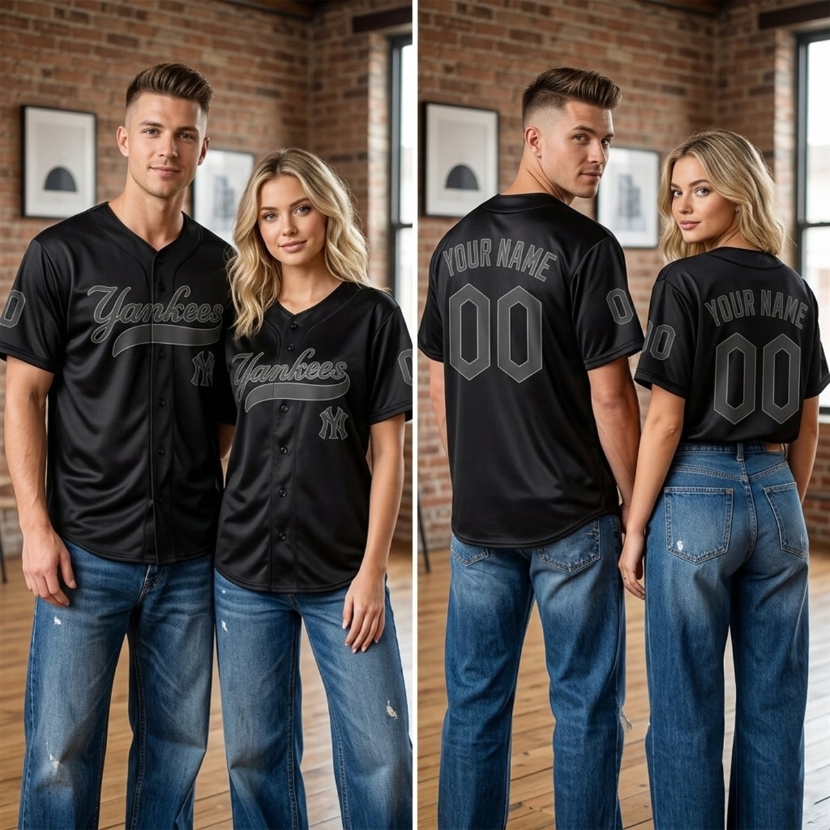 The jersey is a visual masterpiece that reimagines classic team pride through a highly contemporary, monochromatic lens. Featuring a pitch-black base, this jersey utilizes subtle, charcoal-grey detailing for the iconic “Yankees” chest script and the legendary interlocking “NY” logo.