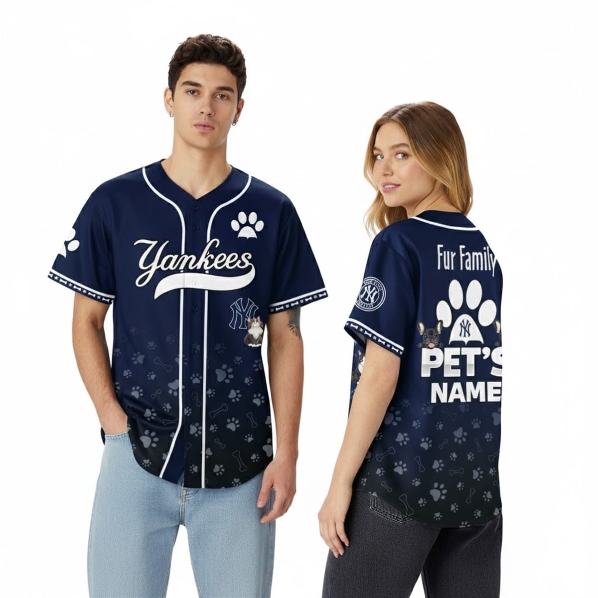 The jersey is a visual masterpiece for sports enthusiasts who view their pets as family members. The design features a stunning dark navy blue base that gently fades into a sleek black at the hem, mirroring the intensity of a nighttime game at the stadium. The front proudly displays the iconic “Yankees” script across the chest, accompanied by the legendary interlocking NY logo. Adding a whimsical touch, a subtle pattern of scattered paw prints and dog bones floats across the lower half of the garment. On the reverse side, a bold “Fur Family” banner arcs above a massive paw print, framing the centerpiece: a customizable, bold white text block where you can proudly display your specific pet’s name. Charming illustrations of a French Bulldog and a Tuxedo Cat flank the custom name, finalizing the pet-centric aesthetic.