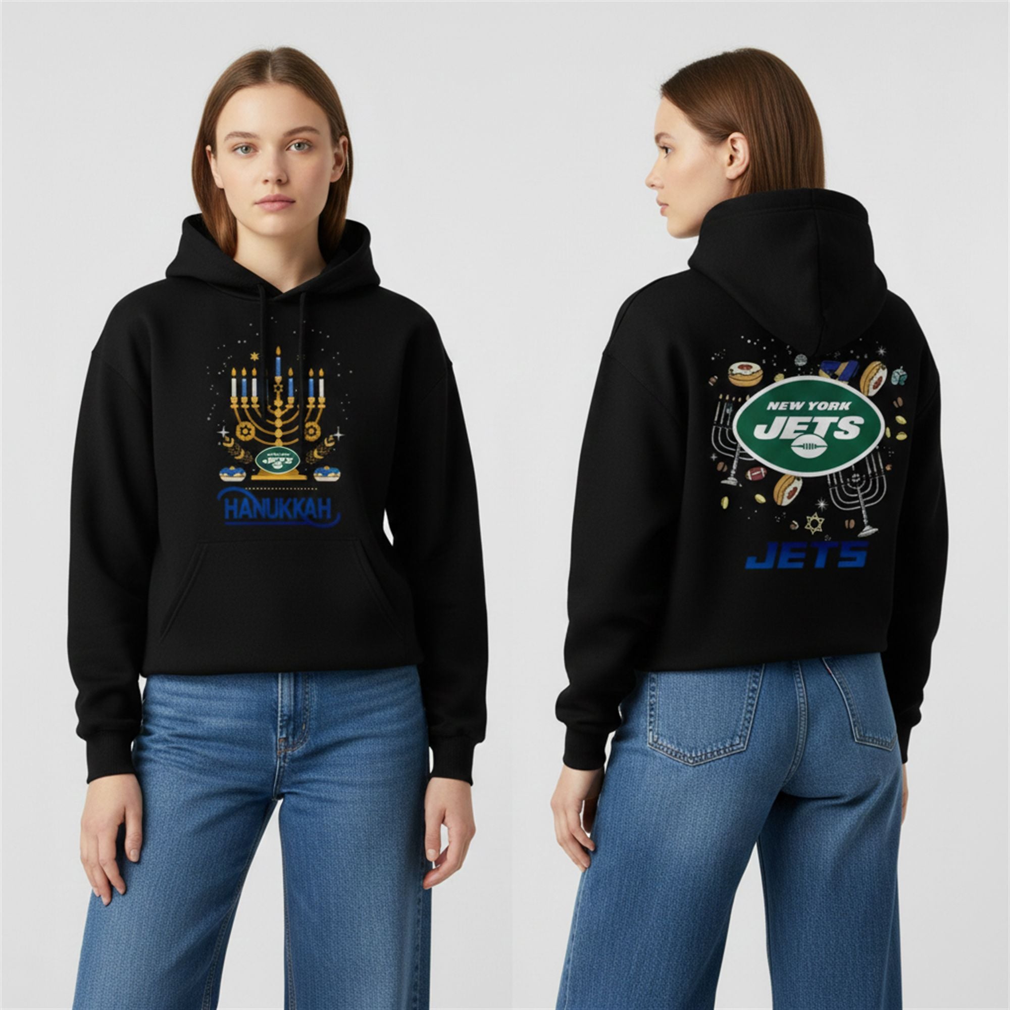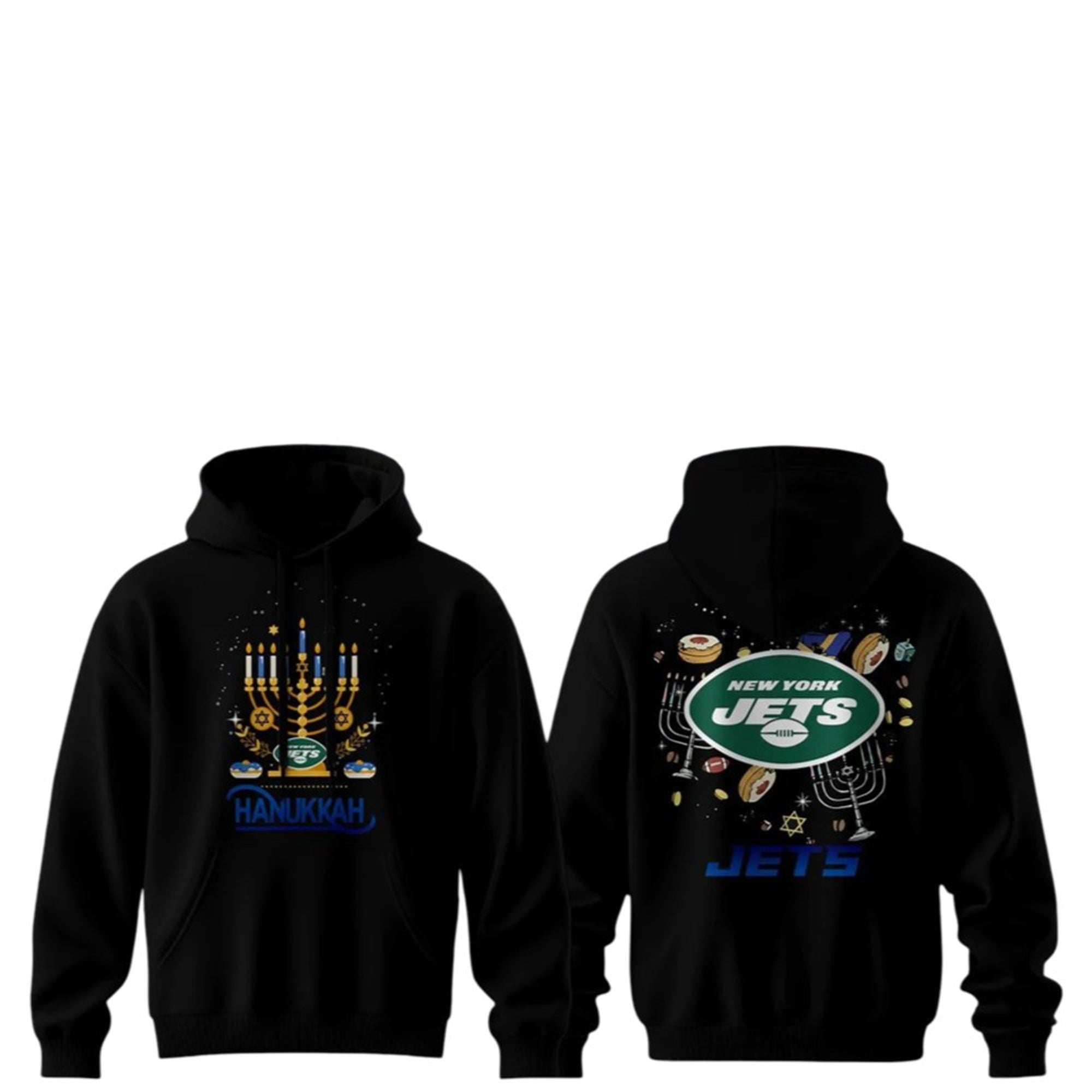 The holiday season in New York is synonymous with two things: the glow of the Menorah and the grit of New York Jets football. This hoodie captures that dual excitement perfectly. Designed for the modern fan, this black pullover features a vibrant, high-definition print that pops against the dark fabric, making it a standout piece for any winter wardrobe.