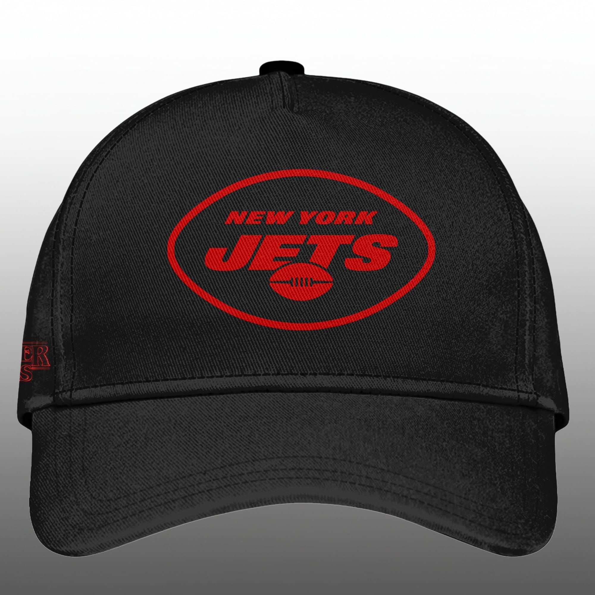 The design is a masterclass in collaboration, utilizing the signature red and stylized font of the Stranger Things universe for all graphics. The front features a bold, graphic “JETS” in the classic show-inspired typeface, anchored by the traditional Jets football logo. The back is the statement piece, featuring the unmistakable “STRANGER THINGS” logo towering over a larger New York Jets football oval, making it instantly recognizable to both enthusiasts and Netflix viewers. This is essential limited-edition Jets gear for the 2026 season and beyond.