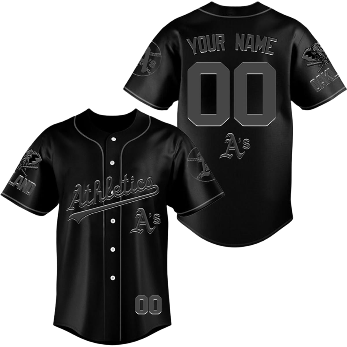 The jersey is a visual triumph in sports fashion. The design features a completely black base, accented by dark charcoal and gunmetal grey lettering and logos. The iconic “Athletics” script across the chest, the legendary “A’s” insignia, and the historic elephant logo on the sleeve are all rendered in a striking, tone-on-tone style. This stealth aesthetic creates a dynamic interplay of shadows and light, ensuring the team’s historic symbols are visible yet mysteriously understated. It bridges the gap between a classic baseball silhouette and high-end, minimalist streetwear.