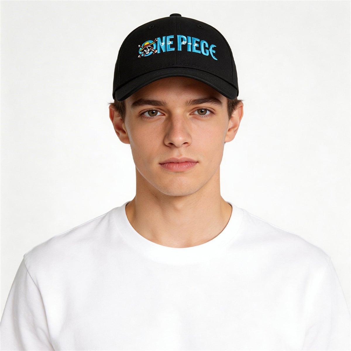The hat is a masterclass in minimalist pop-culture fashion. The crown and visor feature a deep, uniform black tone that serves as the perfect backdrop for the centerpiece: the classic “ONE PIECE” anime title logo. However, this edition brings a fresh, contemporary twist by utilizing a vibrant, light blue thread that evokes the spirit of the open ocean. The letter “O” is ingeniously replaced by the beloved Straw Hat Jolly Roger—a grinning skull and crossbones sporting Monkey D. Luffy’s signature straw hat. This striking color contrast ensures the logo pops visually, making it a distinctive focal point.