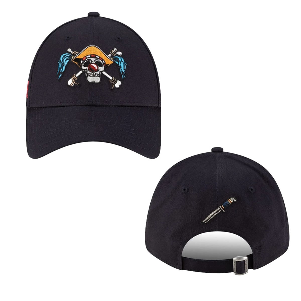 Turning to the side, the cap proudly displays a highly customized “ONE PIECE” logo. This typography is brilliantly modified to match Buggy’s chaotic aesthetic, substituting standard lettering with thematic pirate elements and his unmistakable clown visage. Finally, the rear profile offers a subtle but brilliant easter egg: an embroidered throwing knife, paying homage to his classic hidden weaponry and early battles in the East Blue. Every visual element works in harmony to create a piece of wearable art that demands attention from fellow fans.