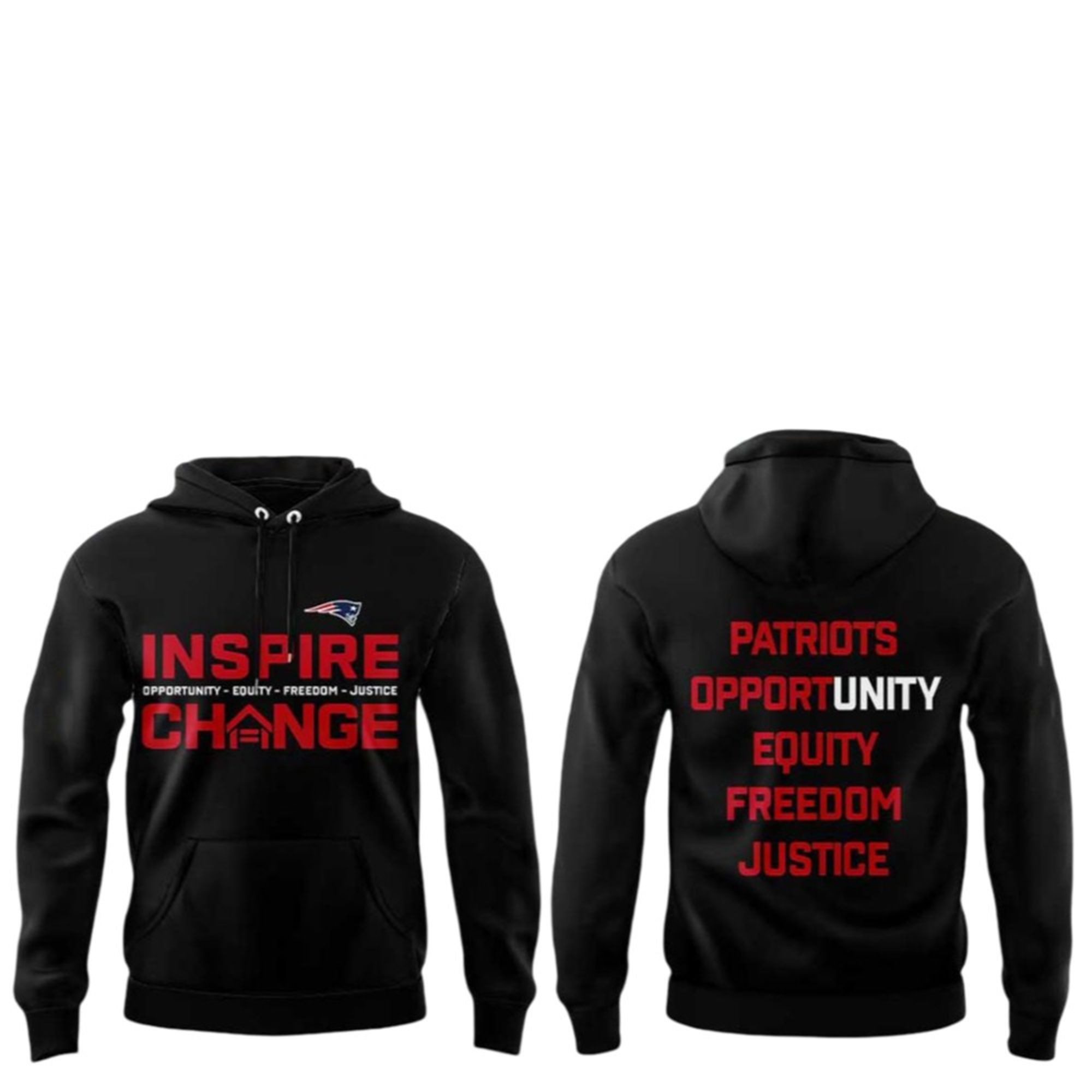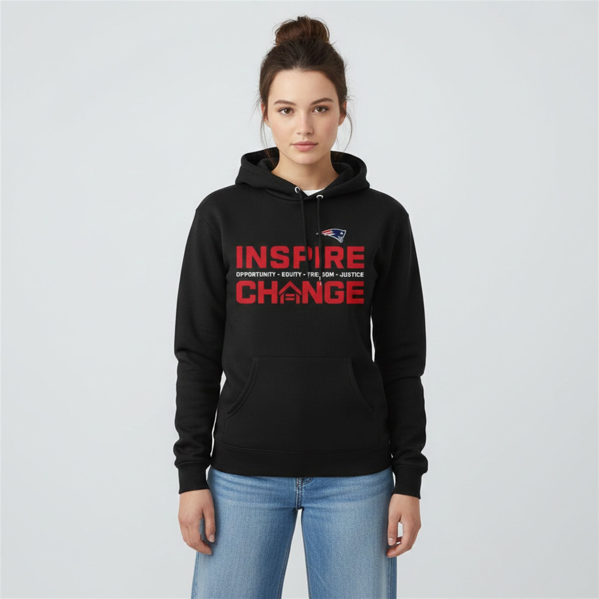 The front of the hoodie features the New England Patriots logo alongside the impactful “INSPIRE CHANGE” slogan in bold, athletic block lettering. A stylized house icon replaces the “A” in “CHANGE,” symbolizing the importance of building strong communities. Beneath the main slogan, the four pillars of the initiative—Opportunity, Equity, Freedom, Justice—are listed in crisp white text.