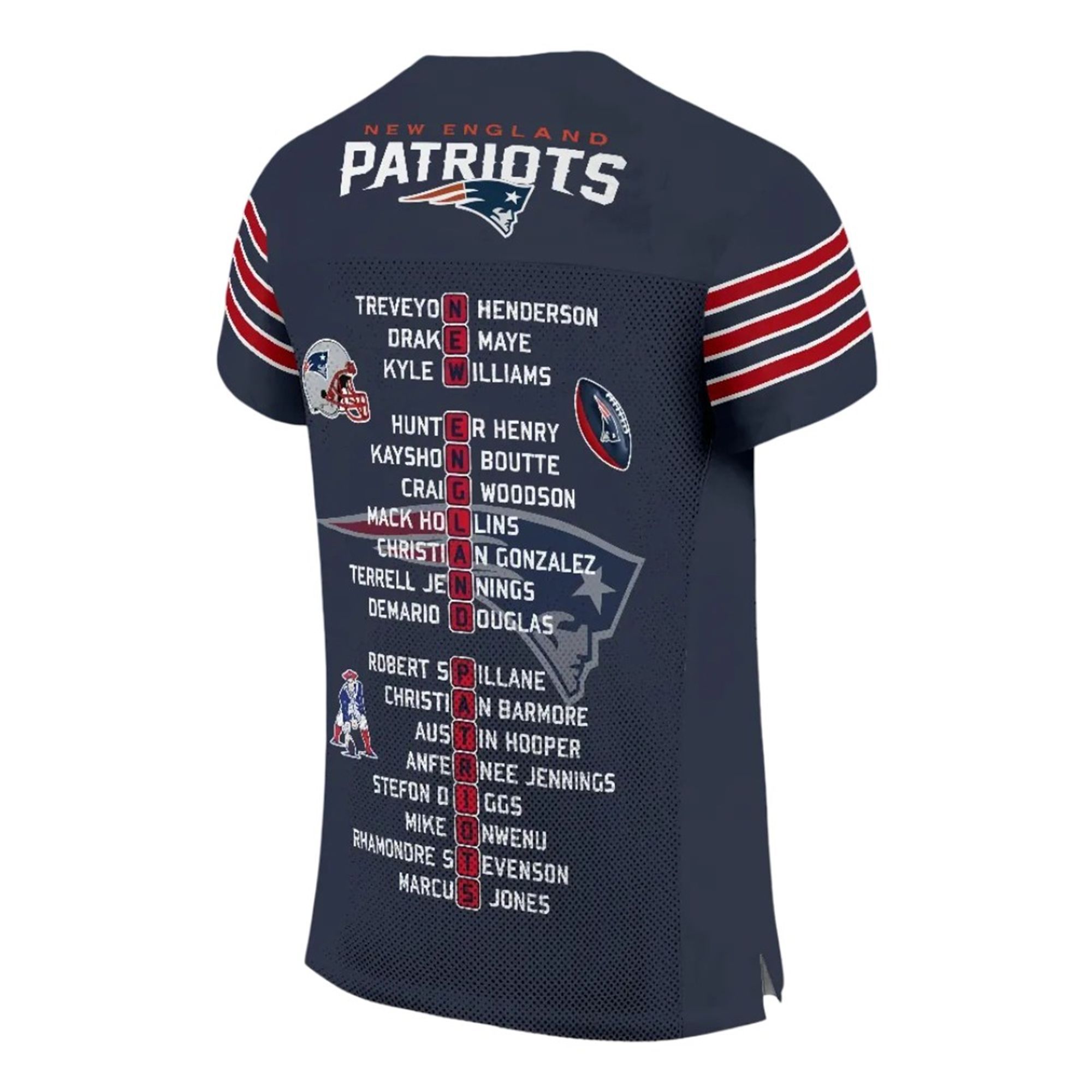 This isn’t a standard generic jersey; it is a historical record of the team that defied the odds. The back of the jersey features a unique, typographic tribute to the starting lineup and key playmakers. The design proudly displays the names of the 2026 icons, including franchise quarterback Drake Maye, the electrifying TreVeyon Henderson, and defensive stalwarts like Christian Gonzalez and Marcus Jones.