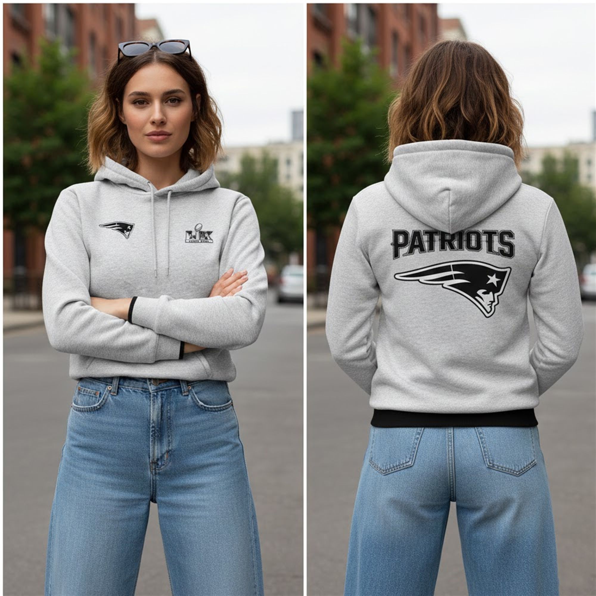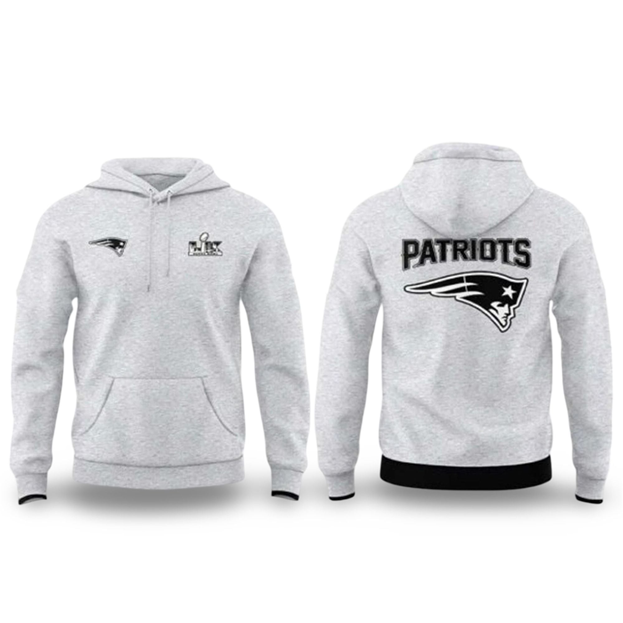 This hoodie features a clean, athletic aesthetic that stands out in any crowd. The chest proudly displays the Super Bowl LX logo opposite the iconic Patriots “Flying Elvis,” creating a balanced, symmetrical look that screams “championship caliber.” The heathered grey canvas serves as the perfect backdrop for the sharp, high-contrast graphics, ensuring the team identity pops on camera and in person.