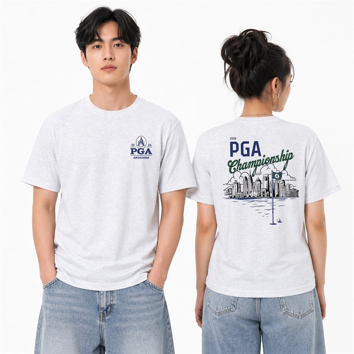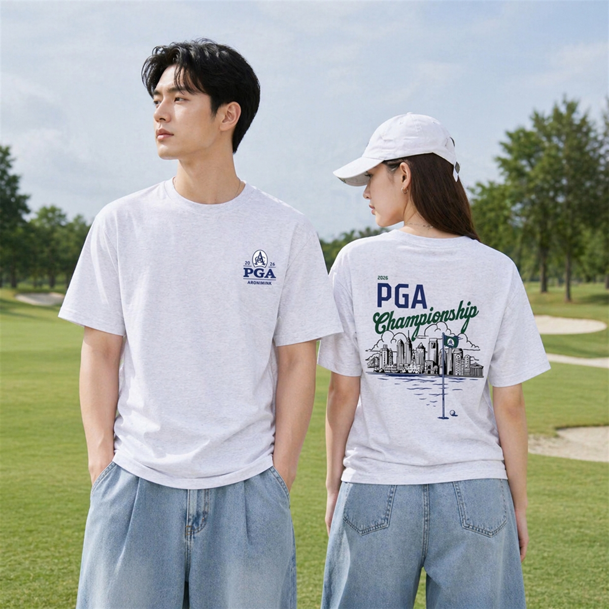 The tee is a masterclass in event-driven visual design. The front of the garment presents a minimalist, sophisticated crest that proudly displays the “2026 PGA Aronimink” insignia, serving as a subtle nod to the prestigious tournament. The true showstopper, however, is located on the reverse side. The back features a sweeping, highly detailed illustration that merges the beautiful game of golf with urban architecture. Underneath the bold “2026 PGA Championship” typography, a stunning sketch of the Philadelphia skyline rises against a stylized sky. In the foreground, a tranquil water hazard reflects the city, while a beautifully illustrated golf hole—complete with a golf ball and a pin flag bearing the Aronimink ‘A‘—anchors the entire composition.