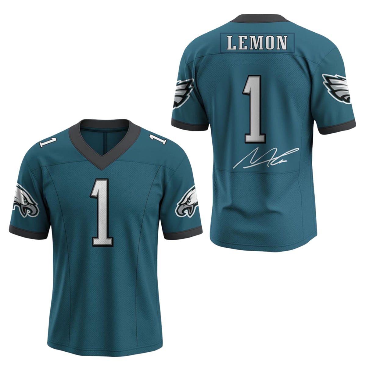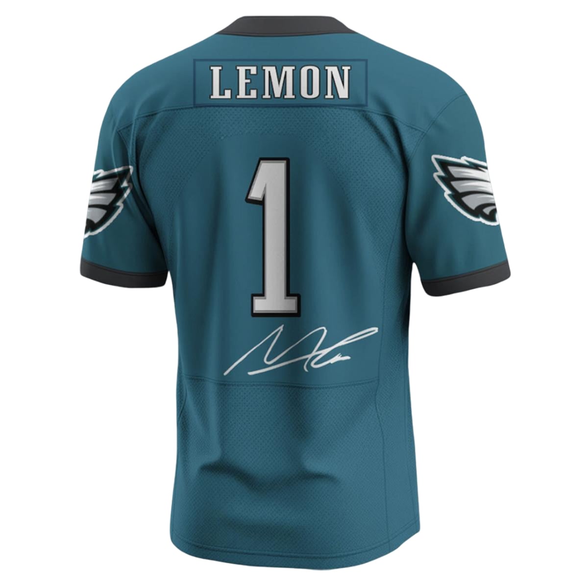 The jersey is a striking visual tribute to one of the most exciting moments in recent franchise history. Featuring the iconic midnight green, pristine white numbering, and bold silver accents, this apparel perfectly encapsulates the legendary Eagles brand. The back of the jersey proudly displays “LEMON” across the nameplate, positioned above a stylized number “1” and an eye-catching printed graphic of the player’s signature. The distinct Eagles logos on the sleeves add a fierce touch to the overall aesthetic. This commemorative item is not just fan apparel; it is a wearable monument to the 2026 Draft. It is designed purely to project team spirit and player pride, allowing fans to boldly sport the identity of their new favorite first-round selection.