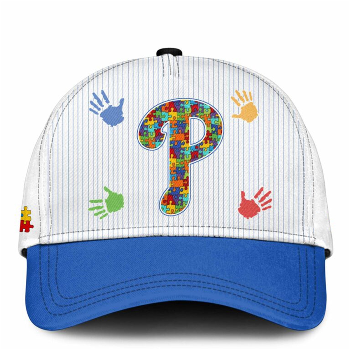 The Interlocking Puzzle Font: The team name “PHILLIES” across the chest, the city “PHILADELPHIA” across the upper back, and the prominent “P” logos are entirely composed of interlocking puzzle pieces. This historical symbol represents the complexity and the diverse, multifaceted nature of the autism spectrum.