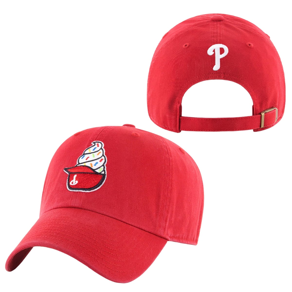 The hat is a brilliant reimagining of traditional sports headwear. Set against a striking, bright red backdrop synonymous with Philadelphia baseball, the front crown proudly displays a beautifully detailed, multicolored embroidery of a vanilla soft-serve ice cream swirl topped with rainbow sprinkles, resting perfectly inside a miniature Phillies batting helmet. Turn the cap around, and you are greeted by the classic, recognizable “P” logo on the back, anchoring the playful front design with historic team tradition. An adjustable strap ensures a customizable fit for various head sizes, offering a relaxed, comfortable silhouette ideal for all-day wear.