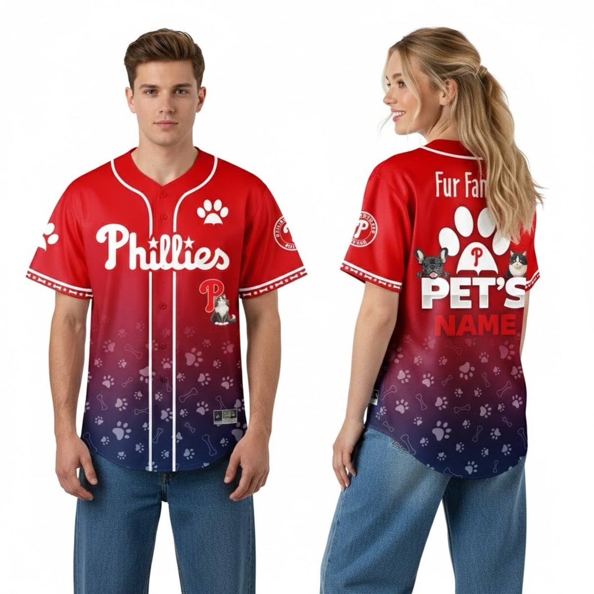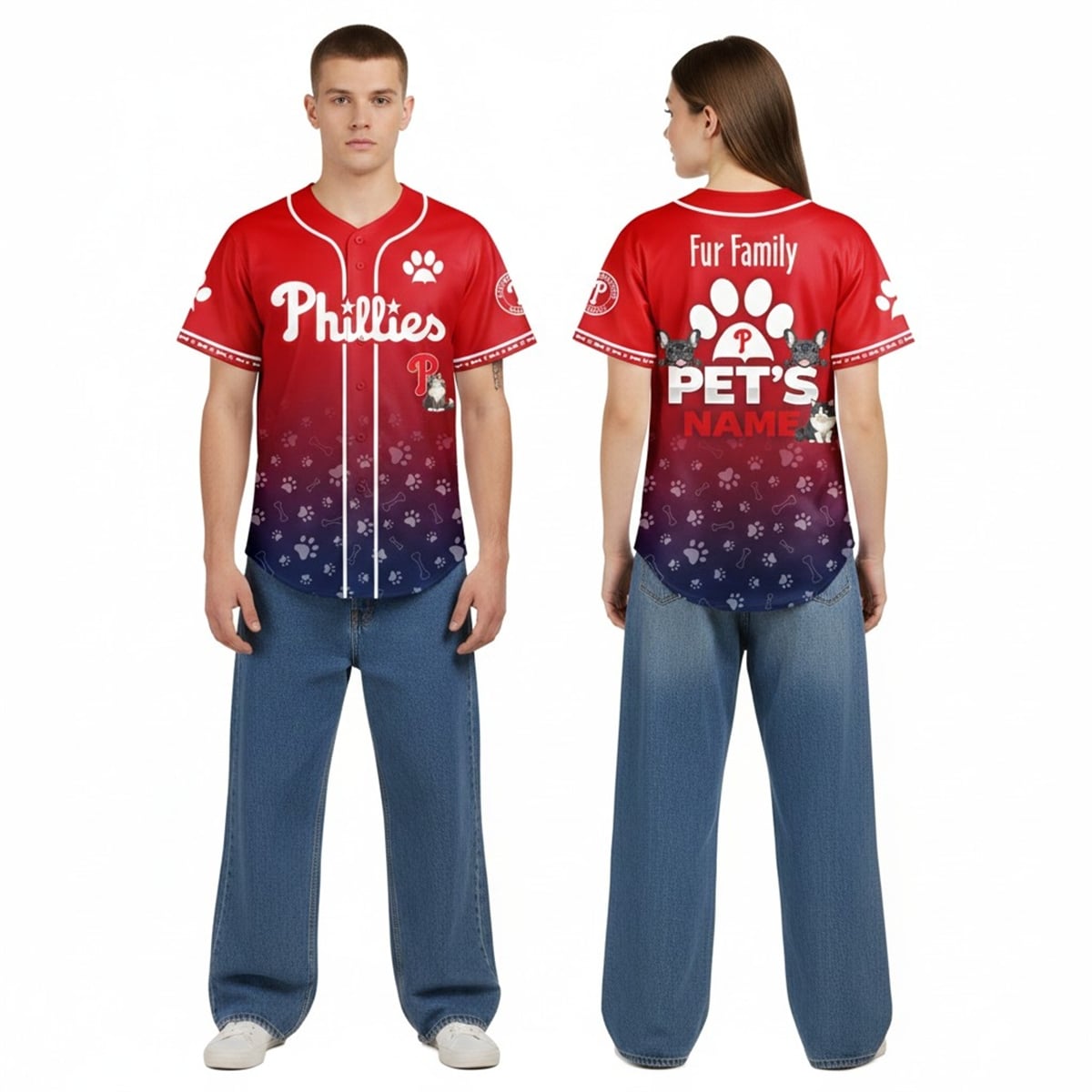 The jersey is a brilliant reimagining of traditional sports apparel, specifically engineered for the modern pet owner. The visually dynamic front features the iconic Phillies script logo set against a stylish gradient background, beautifully accented with scattered paw prints and playful bone motifs. The back of the jersey takes personalization to the next level, boldly displaying the phrase “Fur Family” above a large paw print icon. Most importantly, it offers a prominent customization zone where buyers can proudly display their own pet’s name, flanked by adorable, stylized graphics of a dog and a cat.