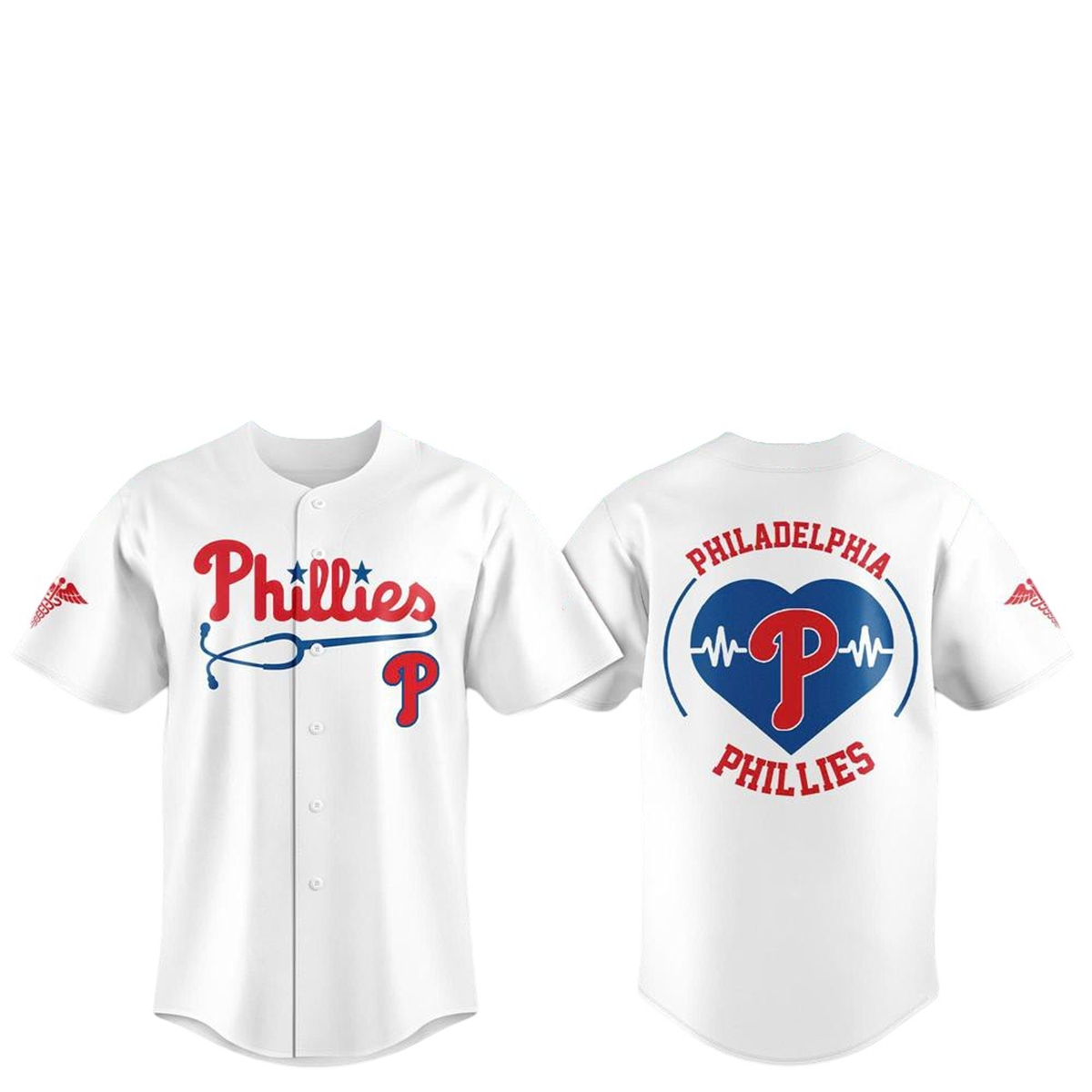 On the right sleeve, a distinct white caduceus emblem—the universal insignia of medicine featuring winged staffs and serpents—adds another layer of thoughtful symbolism. The reverse side is just as visually commanding. It features the words “PHILADELPHIA” and “PHILLIES” arched cleanly in white lettering. Sandwiched between the text is a large, vibrant blue heart bisected by a dynamic red EKG pulse line, mimicking the rhythm of a heartbeat. Nestled directly in the center of this heart is the undeniable Philadelphia Phillies ‘P‘ logo, cementing the bond between the city, the team, and the healthcare sector.