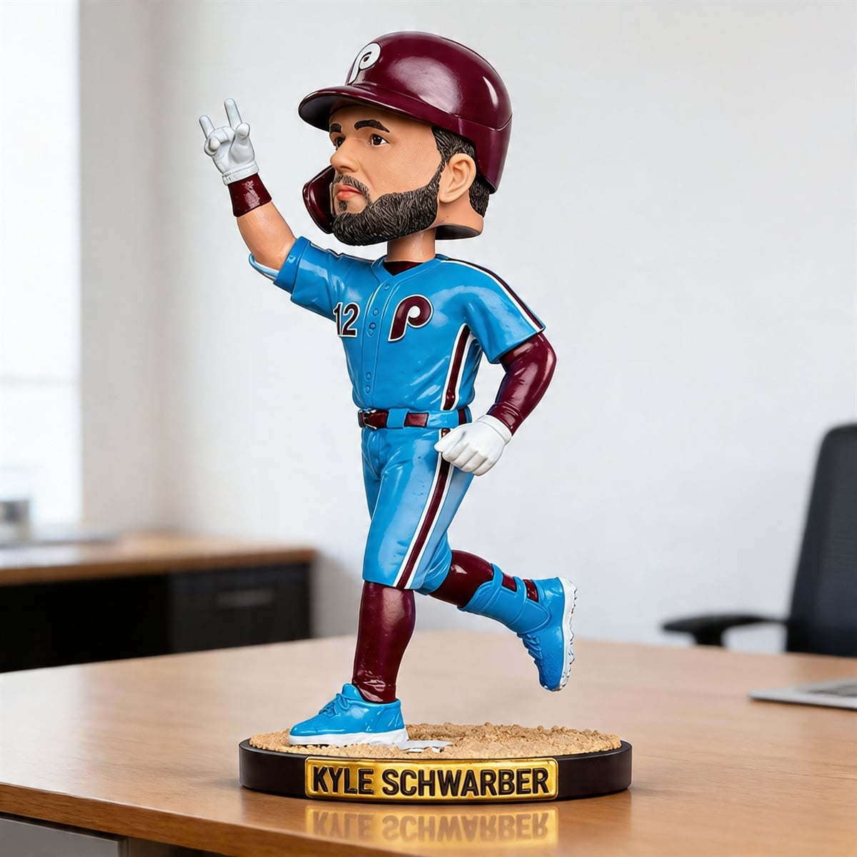 The bobblehead is a masterclass in capturing athletic personality and team spirit. This visually striking collectible features the renowned slugger in mid-stride, rounding the bases after crushing yet another home run. He is depicted wearing the beloved retro powder blue and maroon uniform—a color palette that instantly evokes the rich, storied history of Philadelphia baseball while remaining a massive favorite among the modern fanbase. His hand is raised in his signature celebration, creating a dynamic, action-oriented silhouette that stands out on any display shelf.