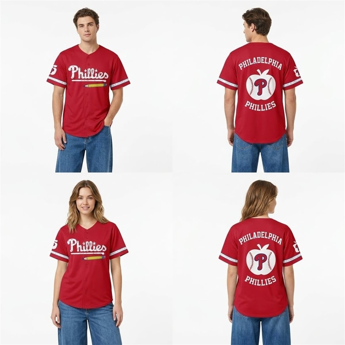 The jersey is a visually striking celebration of both baseball and education. Bathed in the classic, vibrant red that fans instantly recognize, the design replaces standard team typography with a nostalgic, distressed chalkboard font spelling out “Phillies” across the chest. Directly beneath the team name rests a bright yellow pencil graphic, playfully underlining the team’s identity. The back of the jersey is equally compelling, featuring an oversized white apple graphic detailed with iconic red baseball laces. Nestled perfectly inside the apple is the signature Phillies ‘P‘, flanked by the words “PHILADELPHIA” and “PHILLIES” in a bold, arched collegiate typeface.