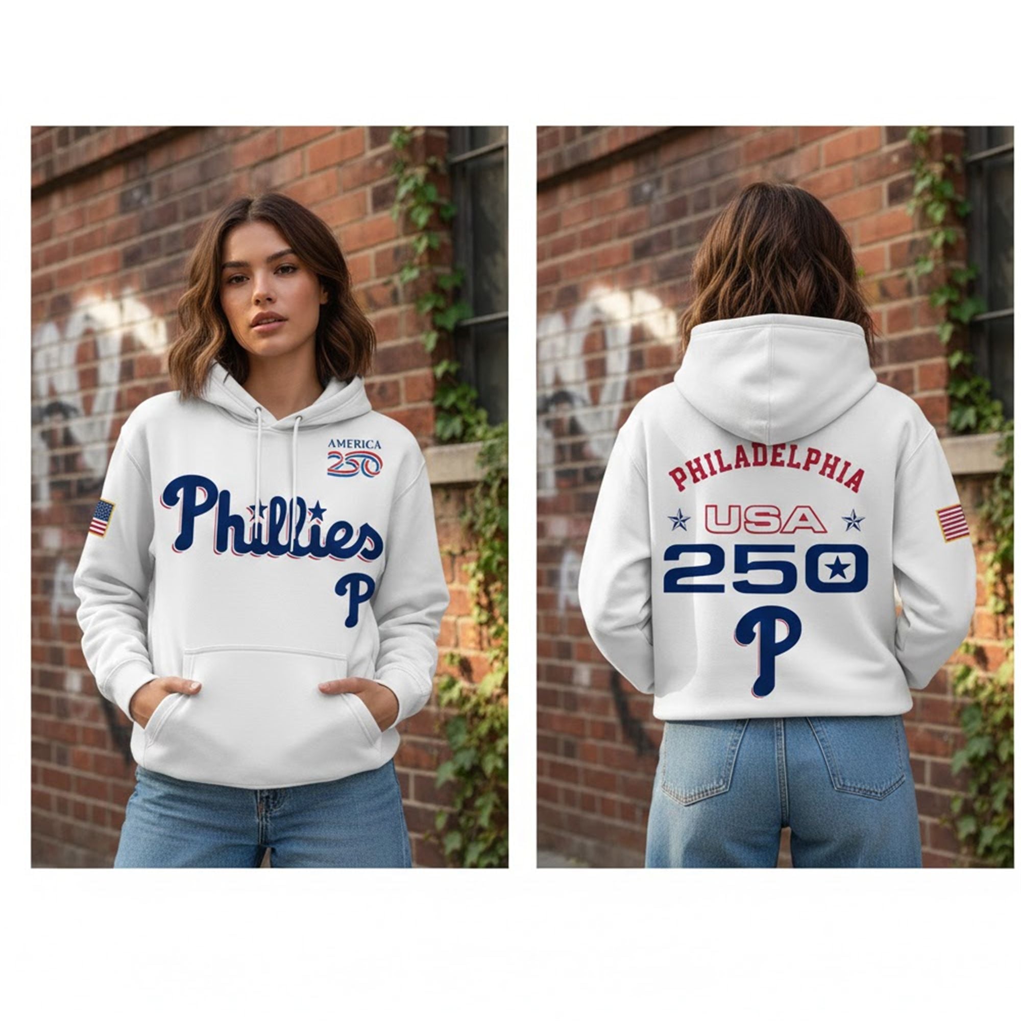 This hoodie exploded across social media after being spotted on a star player walking into Citizens Bank Park during the early 2026 pre-season media day. Fans immediately resonated with the perfect fusion of the classic Phillies script and the patriotic “USA 250” branding, symbolized as a unifier for the city. It wasn’t just sports gear; it became for the entire “America 250” celebration in Philly, trending instantly on TikTok and Instagram as the must-have item for the historic year.