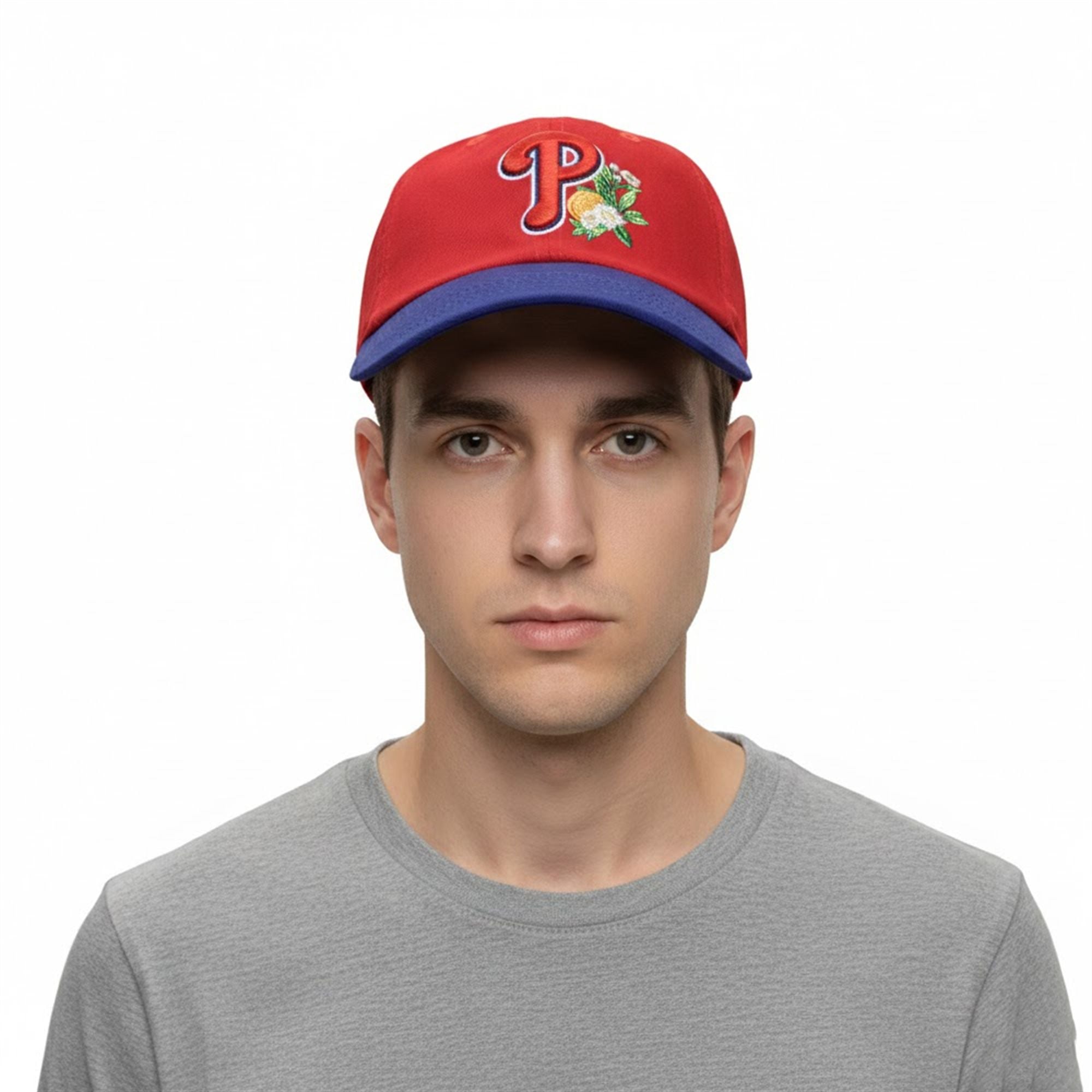 This year’s design is more than just a cap; it is a narrative piece honoring the Phillies’ eight-decade legacy in Clearwater, Florida. The hat features the classic two-tone colorway—a commanding red crown paired with a navy blue visor—that fans instantly recognize. However, the standout feature is the intricate flanking the iconic Philadelphia Phillies “P.” The vibrant orange fruit and delicate white blossoms symbolize new beginnings and the flourishing potential of the 2026 roster. This unique “Clearwater Bloom” motif sets this edition apart from previous years, marking it as a true collector’s item.